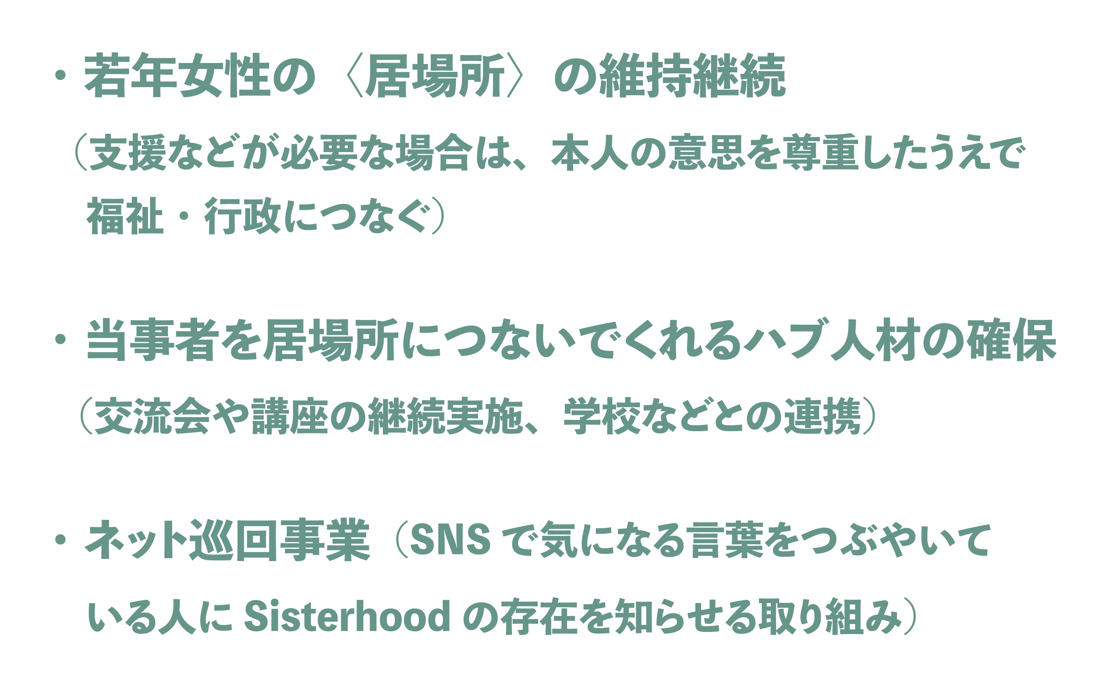 この3つの事業について継続的な運用を図りながら、将来的には「にんしんSOS」窓口事業や、一時的に利用できるシェルターの運営を目指していきたいと考えています。