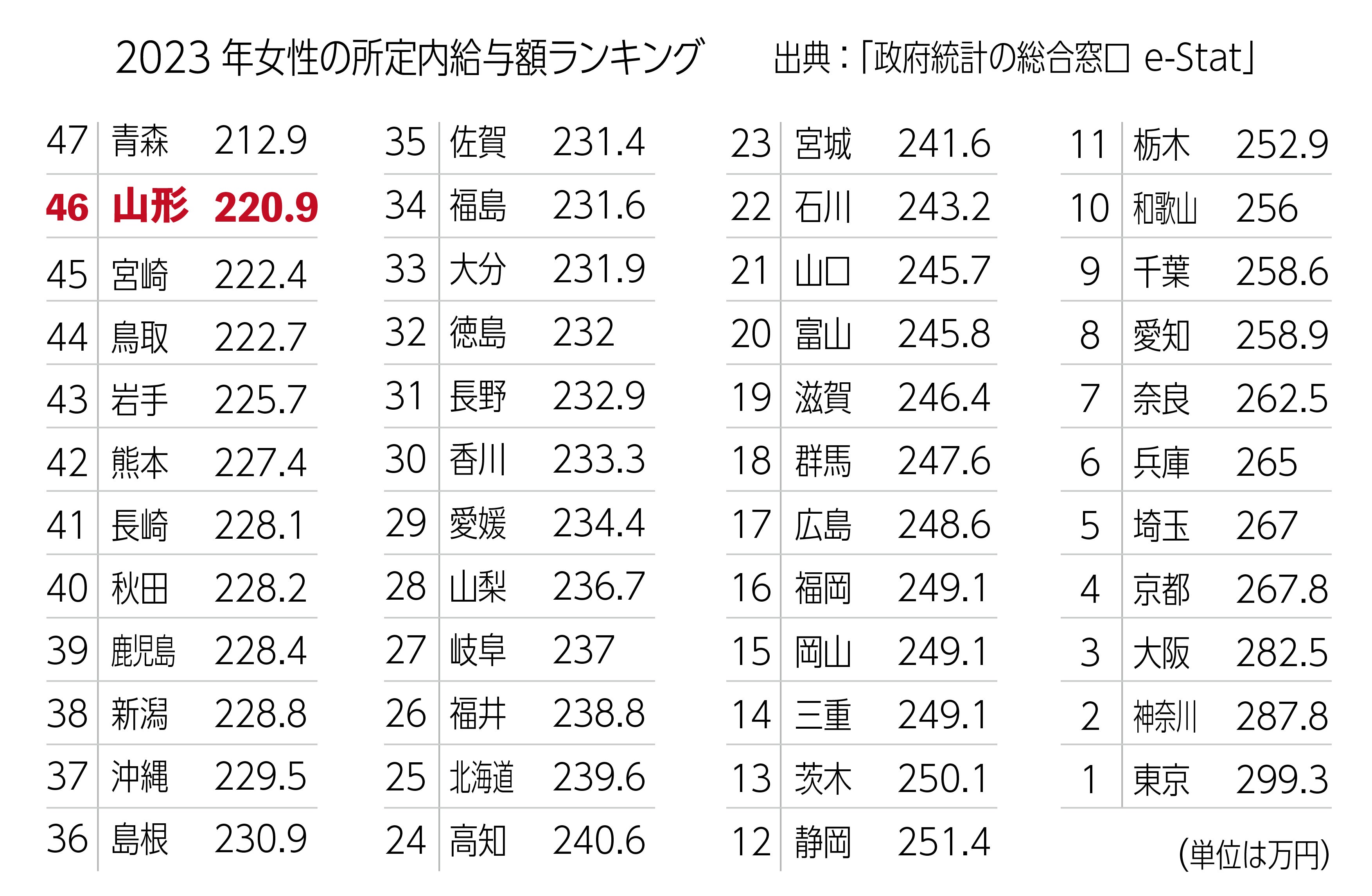 ・女性の賃金が全国で下から2番目 の山形県(2023年女性の所定内給与額)