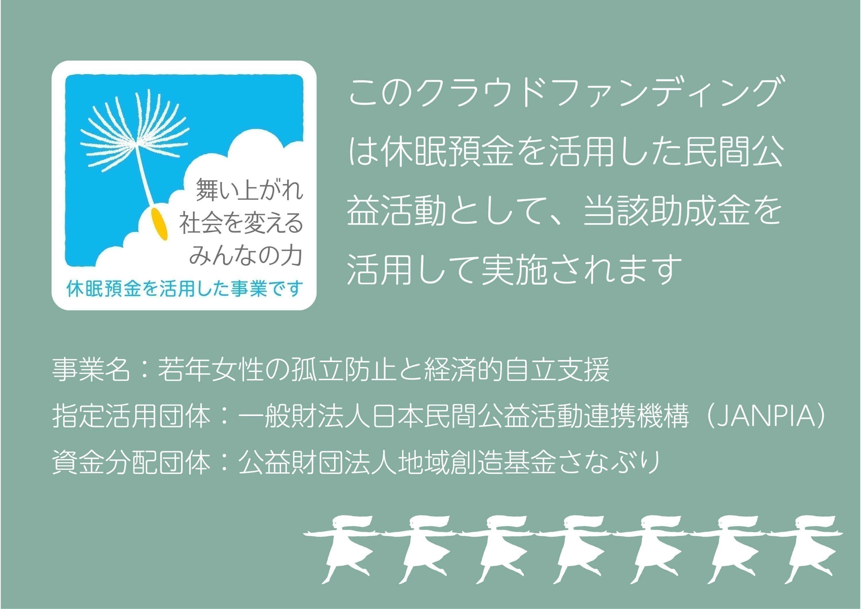 ♦このクラウドファンディングは休眠預金を活用した民間公益活動として、当該助成金を活用して実施されます 事業名:若年女性の孤立防止と経済的自立支援 指定活用団体:一般財法人日本民間公益活動連携機構(JANPIA) 資金分配団体:公益財団法人地域創造基金さなぶり