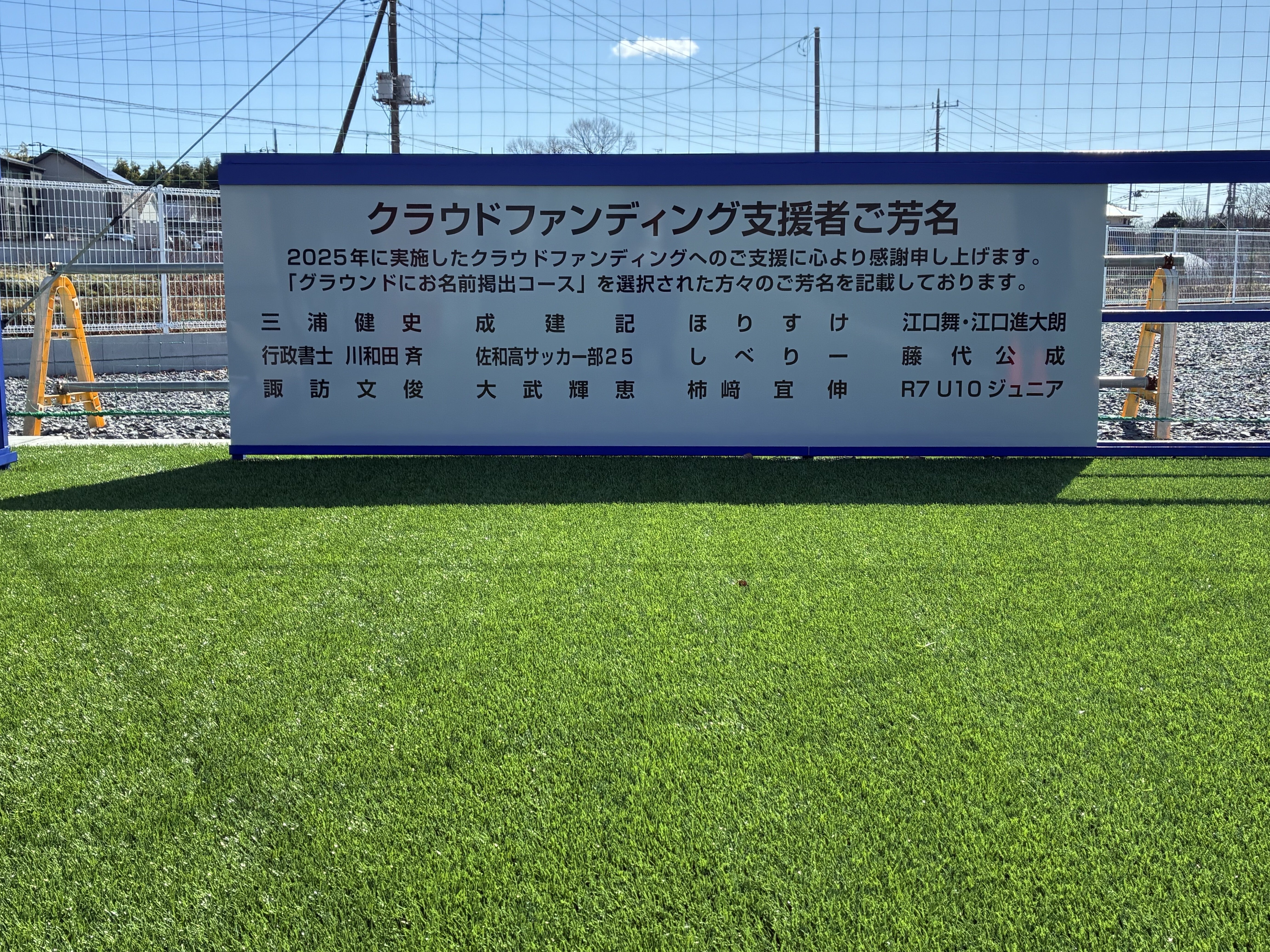 2026/03/16 14:00「グラウンドにお名前掲出コース」にご支援いただいた方々のお名前(ご希望の文字列)をグラウンドに3/1より掲出しています。この度のご支援、誠にありがとうございました。各種イベント等でSISファシリティにお越しの際はぜひご自身でご確認くださいませ。※本コースをご支援いただいた方のうち、ご希望の文字列についてご回答を確認できた方のみを掲出しております※屋外のサッカーグラウンドの周囲のため、汚れ・へこみ等が生じることがあります もっと見るご支援の御礼