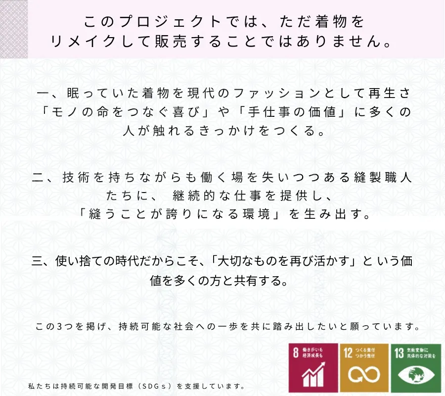 この二つの現実を知ったとき、「着物リメイク」という一つの行動が、文化・雇用・環境の課題をつなぐ糸になると確信しました。ただのリメイクではなく「再生」や「循環」の価値を形にする、それがこのプロジェクトの原点です。
