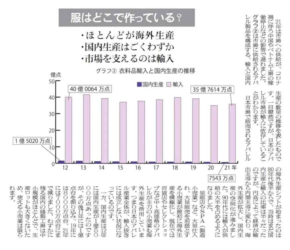 AIの台頭、機械化の進展、そして国際競争が加速するなかで、私たちの暮らしは低コスト・短納期が当たり前になりました。その一方で、「手でつくる」という丁寧な仕事、そこに込められた時間と技術、誇りは、静かに確実に姿を消しつつあります。特に衣類の生産現場ではこの傾向が顕著で、現在日本国内で製造されている衣料品はわずか2.4%(2021年時点)にまで減少しています。かつて40億点以上あった国内生産も、今では7,543万点(輸入品は35億点以上)に留まり、国内の製造現場は風前の灯火です。