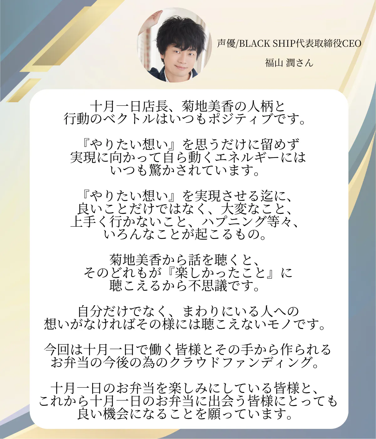 迷う私はあらゆる出来事に背中を押されてこの度皆様にご支援のお願いをさせて頂きます。