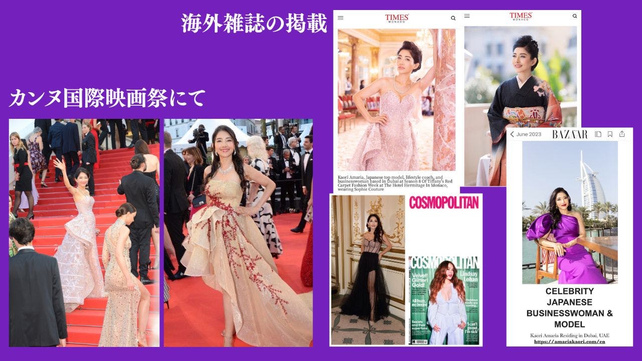 モナコ・パリ・ドバイでファッションモデルとして活動し、 『ELLE』『Forbes』『Cosmopolitan』『Times』などの世界的メディアにも掲載。そしてカンヌ国際映画祭では、レッドカーペットをVIP待遇で3度歩くという経験まで叶いました。