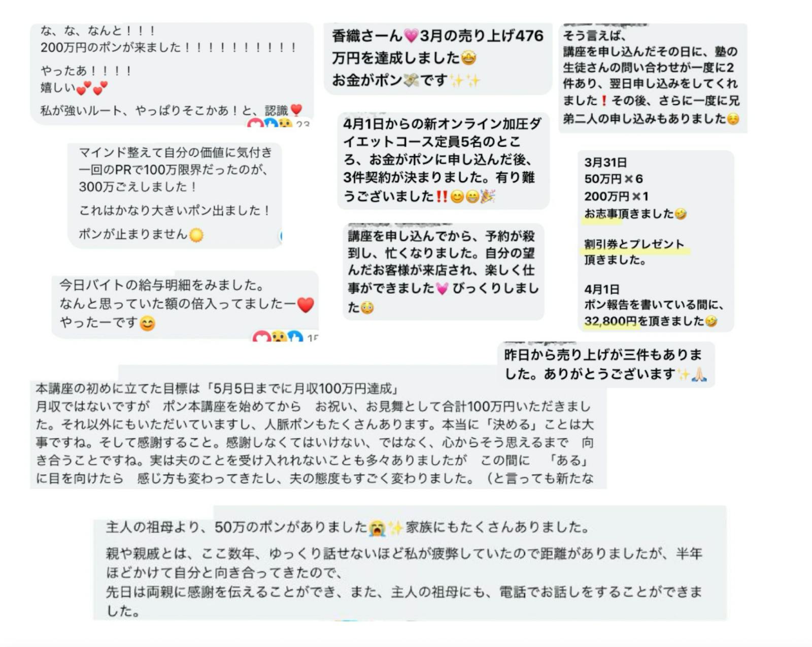 1500万円の詐欺被害によるお金のトラウマを抱えていましたが、受講後に詐欺師に感謝できるまでになり、そこから金銭的なミラクルが連続しました。元夫から子どもへの数百万円の援助があったり、ビジネスでは好調。女性誌や有名メディアからの取材が次々と舞い込み、収入も大きく伸びて諦めかけていたアメリカ進出の夢も奇跡の連続で実現が目の前まできています。