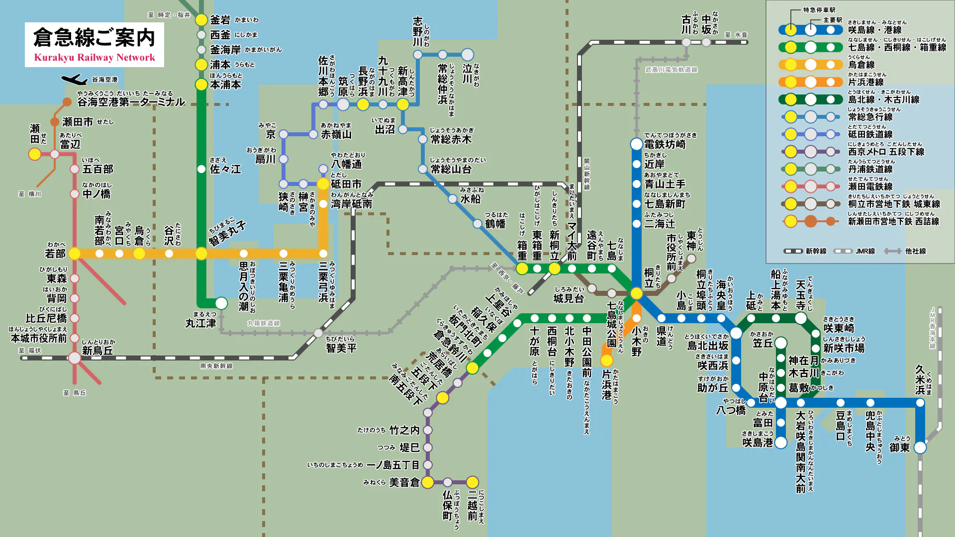 ①11周年の歴史を持つ倉急電鉄の代表者たこたこさんに許可をいただき、下記の本家倉急電鉄路線図の咲島線をイメージした架空の駅・路線を走行できる鉄道ゲームのプロジェクトが始まりました。(以下の画像はゲーム内に収録予定)
