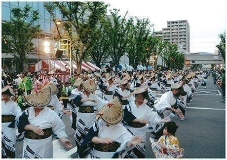 子どもから大人まで、地域の団体や企業、学校、友人グループなど、多彩なチームが思い思いの衣装で踊り、まち全体が一体となって盛り上がります。