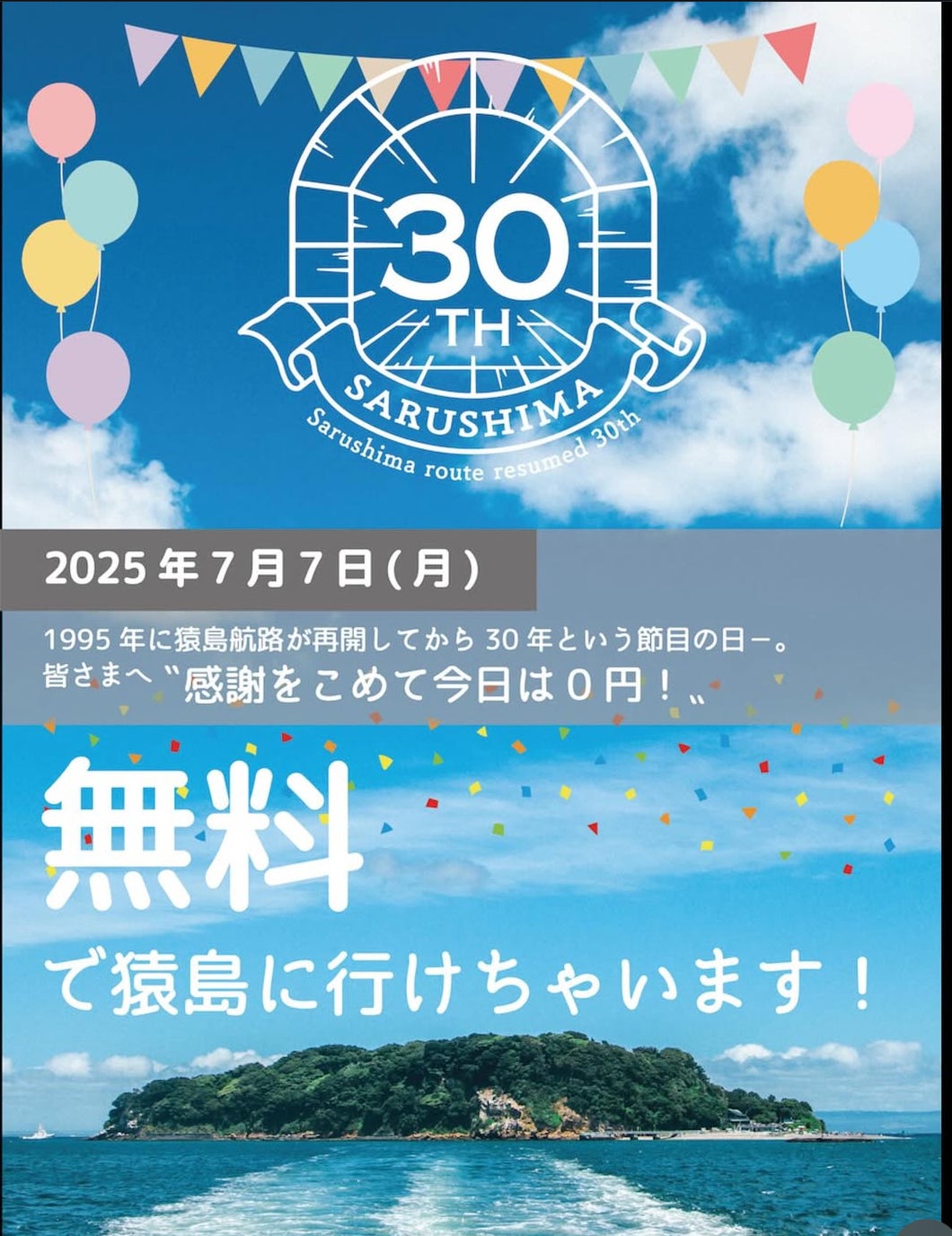 2025/07/05 22:44こんにちは、SUKA HOUSEプロジェクトです!2025年7月7日(月)限定で、なんと猿島航路が全員無料で運航される特別企画が実施されます!これは、1995年の猿島航路再開から30周年を迎える記念日として行われるもの。日頃の感謝を込めて、7月7日に限り「乗船料 0円」で猿島に渡れます青い海と空に囲まれた無人島「猿島」は、自然・歴史・アウトドア体験が詰まった横須賀の誇る観光スポット。この特別な日に、ご家族や愛犬と一緒に訪れてみるのも素敵ですね。SUKA HOUSEでは、今後も横須賀の地域資源やイベントと連携しながら、“この街で暮らす魅力” を再発見できるような発信を続けていきます。 もっと見る
