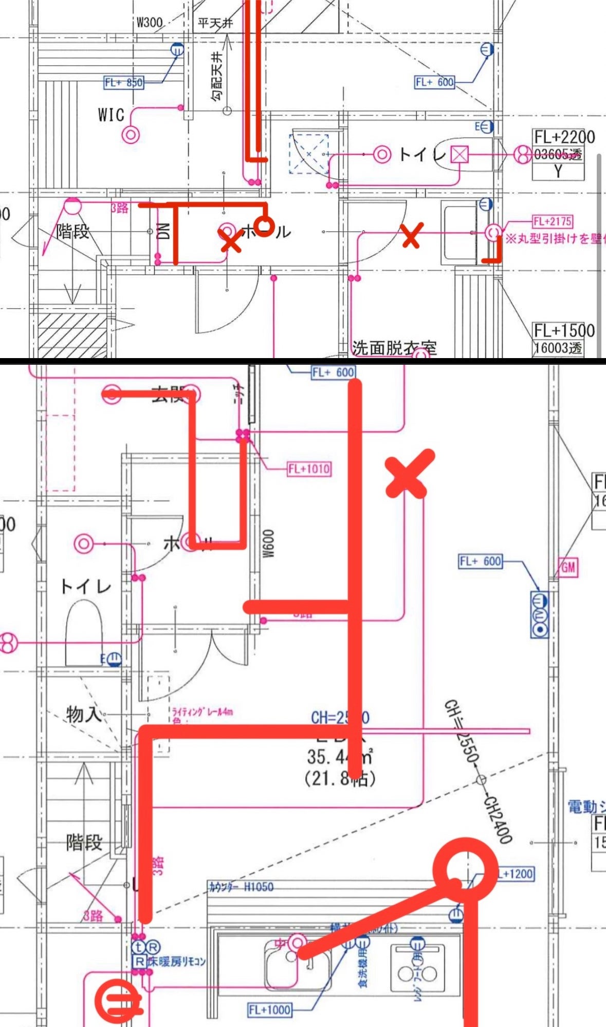 本日は、SUKA HOUSE新築物件の電気配線ルート最終確認の打ち合わせを行いました。キッチンや水回りを中心に、生活動線とメンテナンス性を重視したルート設計に修正を加えています。特に以下のポイントがボトルネック(課題)となっていたため、担当と密に調整を行ってます調整ポイント: • 1階の配線ルートとシーリングでペンダントかレールかダウンか照明は1番悩むところ・キッチン〜洗面エリア〜階段周りまでのルートを整理して影がないよう設置・通路上の無駄な折れや重複配線をカットし、よりシンプルな動線に変更・✕印の箇所は構造上の干渉が懸念されたため、別ルートで対応 • 2階の配線ルート・ホールと各居室への配線引き回しを最適化・照明・換気・スイッチの配置バランスを確認・引き戸や建具の干渉を避けるため、再配線した箇所あり(赤✕マーク)⸻今後の対応 • 電気業者からの最終施工図面を待ち、着工前の最終承認へ • 分電盤位置や、Wi-Fiルーター設置、IoT機器(エアコン連動や給湯器リモコン)もまとめて反映予定 • 施主支給を受付ないので、設置位置と配線ルートの再確認が必要⸻SUKA HOUSEはデザイン性だけでなく、使いやすさと維持管理コストの最小化も意識して設計を進めています。次回は外構工事や植栽、ポスト・インターホン等の玄関まわりの機器配置打ち合わせを予定してい