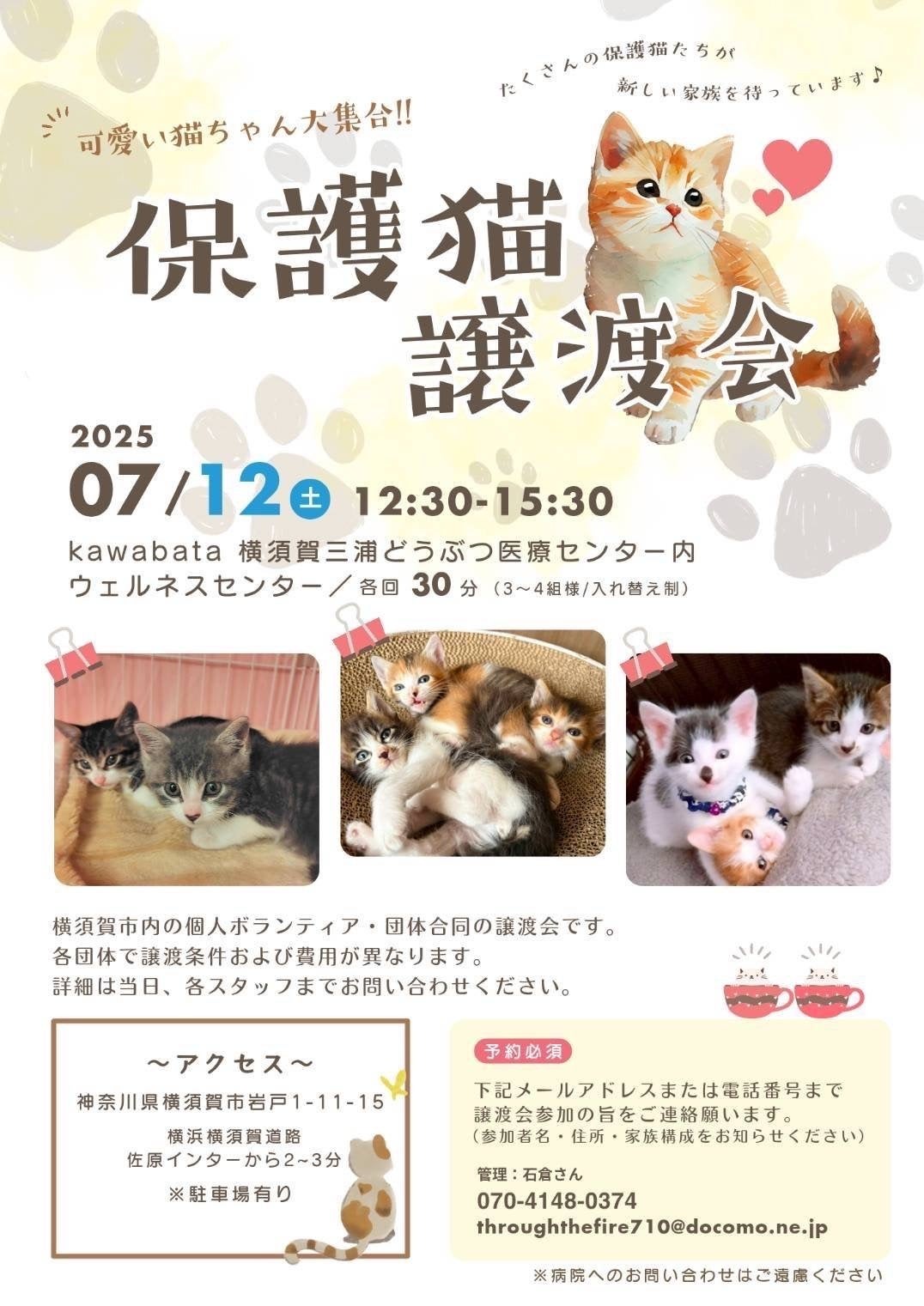 【保護猫 譲渡会のお知らせ】たくさんの猫たちが、新しい家族を探しています。猫と暮らしたい方、保護活動に関心のある方、ぜひご参加ください。■ 日時:2025年7月12日(土)■ 時間:12:30〜15:30(各回30分/3〜4組ずつの入れ替え制)■ 会場:kawabata 横須賀三浦どうぶつ医療センター内 ウェルネスセンター【完全予約制】ご参加希望の方は、以下の連絡先まで「お名前・ご住所・ご家族構成」をご連絡ください。連絡先:電話:070-4148-0374(担当:石倉)メール:throughthefire710@docomo.ne.jp■ アクセス:神奈川県横須賀市岩戸1-11-15横浜横須賀道路「佐原インター」から車で2〜3分(駐車場あり)※参加団体・個人によって譲渡条件や費用が異なります。※病院への直接のお問い合わせはご遠慮ください。たくさんの方のご来場をお待ちしております。