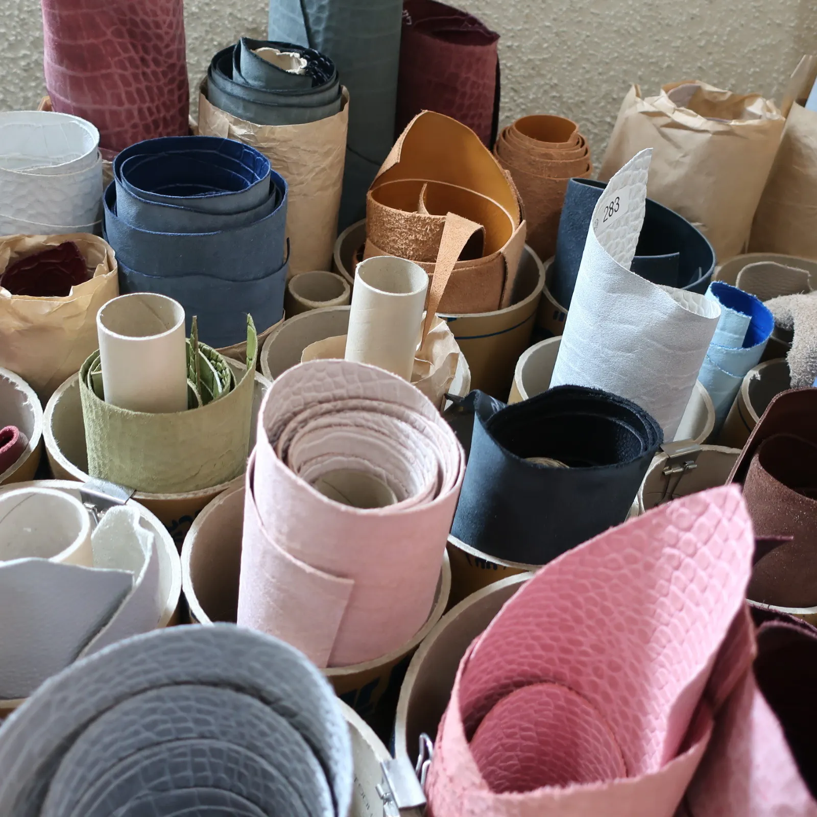 工房内には常時ストックしている数多くの革があります。