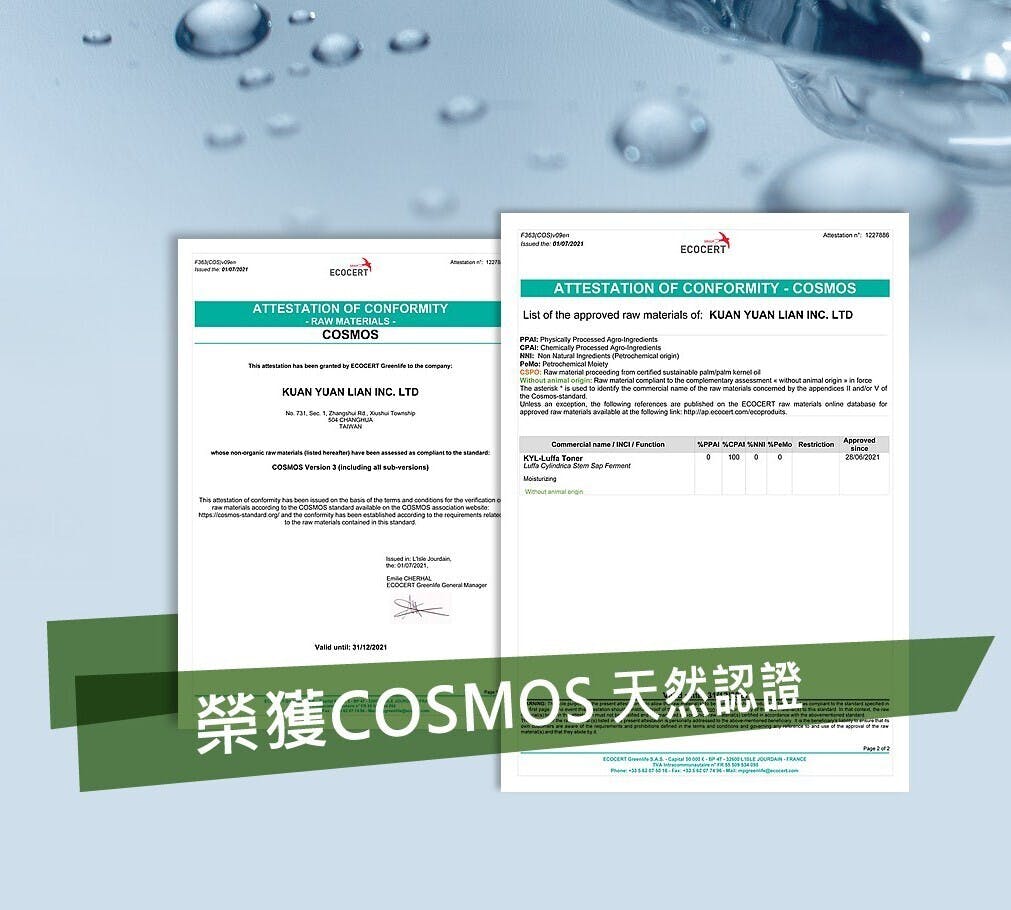 COSMOS Naturalは、国際的なナチュラル化粧品の認証基準「COSMOS」に基づいた認証です。植物由来や天然由来の成分を主原料とし、合成香料や石油系成分を極力使用していないことが保証されたヘチマ水です。