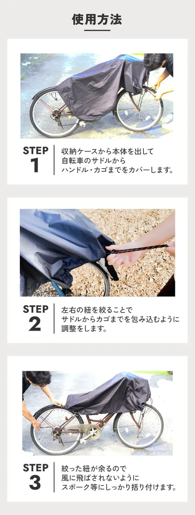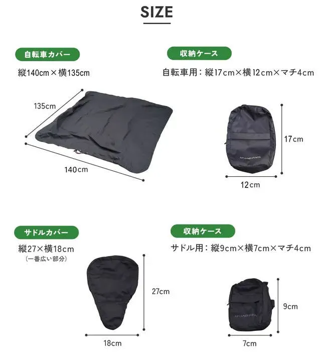 ●自転車カバーは長さ140cmになります。自転車・バイクのサイズをご確認の上、ご購入下さい。大型の自転車の場合は籠が隠れない場合もございます。