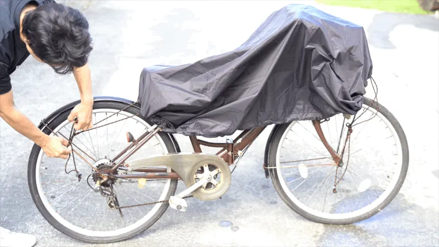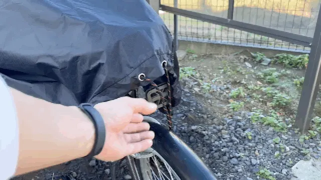 自転車カバー、サドルカバーにはしっかりと固定できる絞り紐が付いています。盗難防止のために紐と自転車にカギでロックすることもできます。