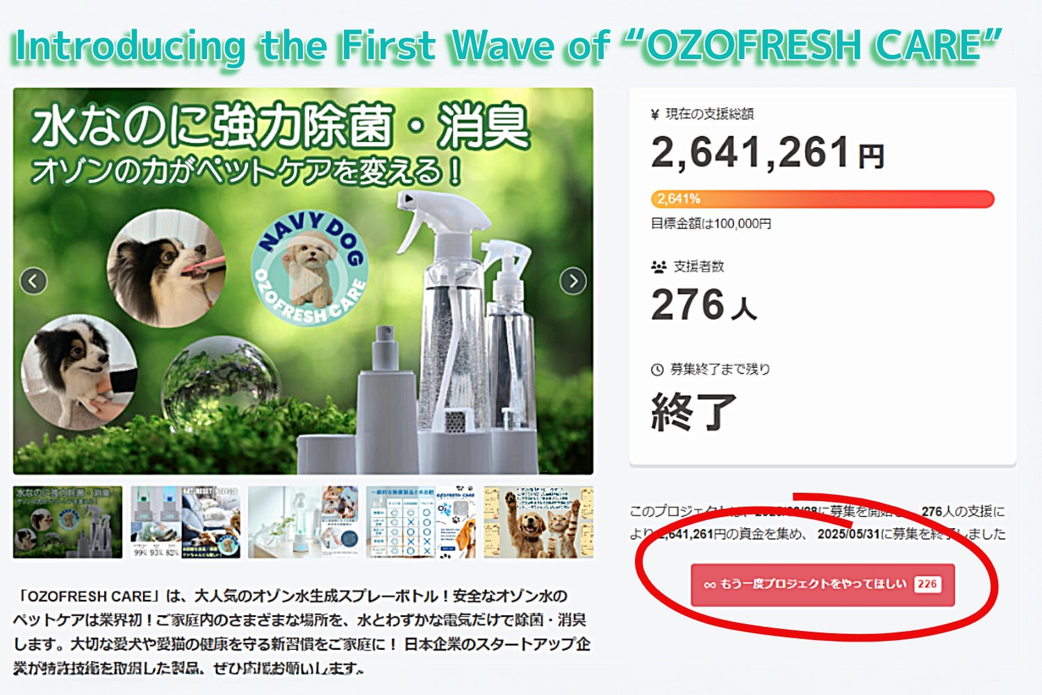 2025/08/31 21:00ついに…「OZOFRESH CARE」クラウドファンディング、残り2時間ちょっとで終了となります!!ここまで応援してくださった皆さま、本当にありがとうございます!皆さまのご支援とシェアが、この挑戦をここまで押し上げてくれました。ラストスパートは、プロジェクトにとって本当に大切な時間です。「気になっていたけどまだ…」という方に、ぜひ最後のご案内を!安心でやさしいオゾン水ケアを、もっと多くのワンちゃん・ネコちゃんに届けるために――これから製品化に向けてさらに努力を重ね、一人でも多くのワンちゃん・ネコちゃんに「安心でやさしいオゾン水ケア」を届けてまいります。ラスト2時間、全力で駆け抜けます!どうか最後まで見守ってください!そして応援よろしくお願いいたします!!私たちの挑戦を信じ、支えてくださったイノベーター・アーリーアダプターの皆さまへその応援こそが、このプロジェクトの大きな原動力になっています。改めて、心から感謝申し上げます。来年以降は インターペットをはじめ、全国の展示会やイベントを通じて、皆さまに直接お会いし、御礼をお伝えできればと考えております。そして今は、クラウドファンディング限定の特別価格でご支援いただける最後のチャンスでもあります。ぜひこの機会に 「OZOFRESH CARE」 をお試しいただき、大切な愛犬・愛猫の新しいペットケア習慣を、一緒に広めていただければ嬉しいです。 もっと見る
