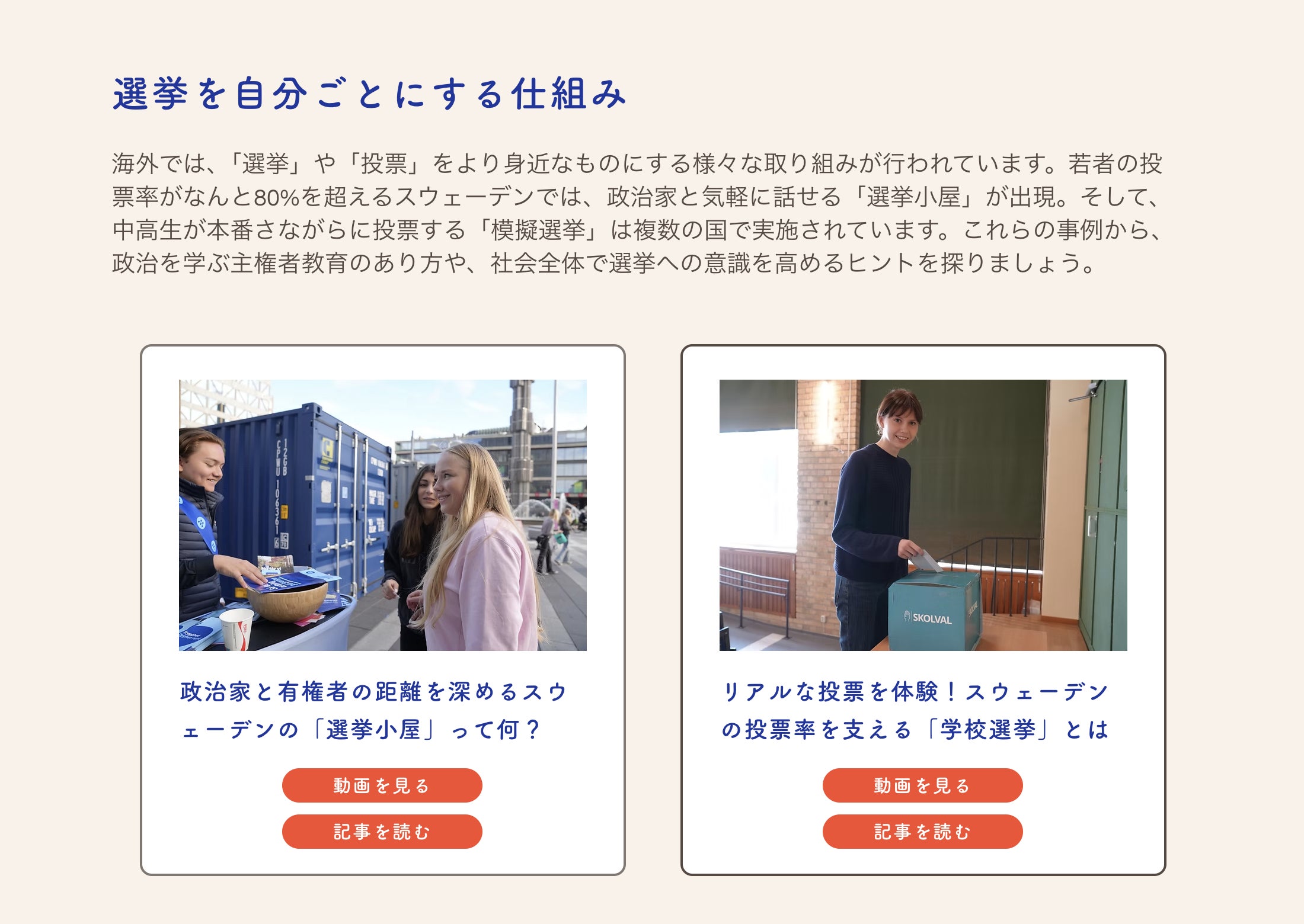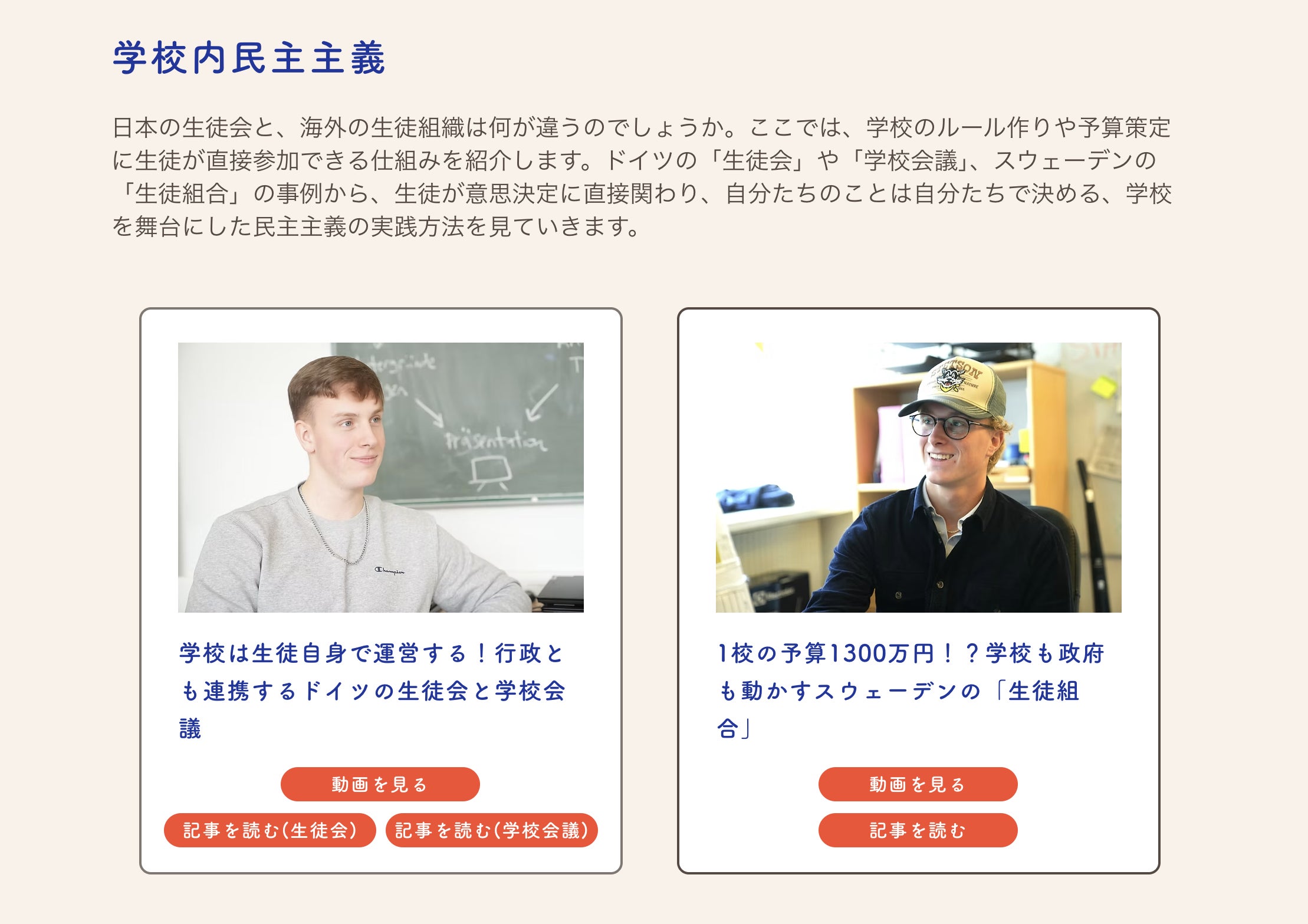 スウェーデン、イギリス、フランス、ドイツ、台湾など、若者の政治参加が進む国で、数百人を超える方にこれまで取材をしてきました。そこで見聞きした具体的な政治参加の仕組みや、社会を変えるこどもたちの生の声をまとめた動画、記事を紹介します。
