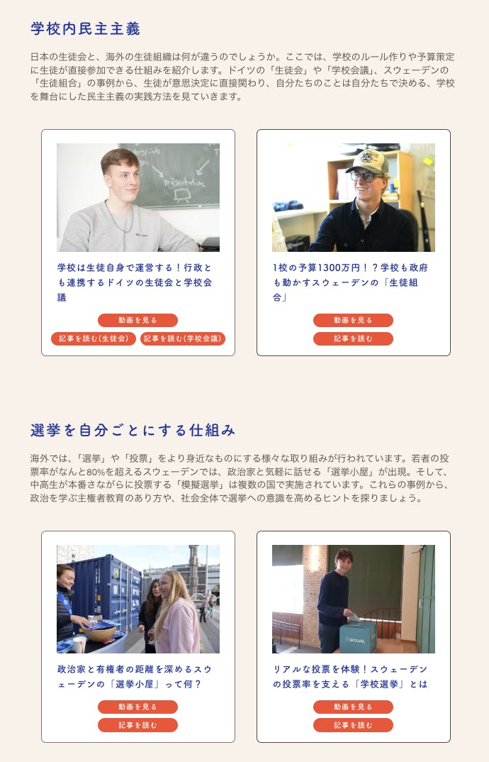 さらに、政治を実践的に学ぶ海外の授業内容、国や政府が主体となって若者の政治参加を支援する仕組みのほか、学校の先生に向けた主権者教育のヒントも紹介しています。