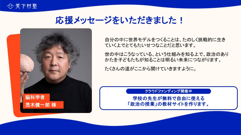 2025/07/15 20:18茂木健一郎様より、応援メッセージをいただきました!自分の中に世界モデルをつくることは、たのしく挑戦的に生きていく上でとてもたいせつなことだと思います。世の中はこうなっている、という仕組みを知る上で、政治のありかたを子どもたちが知ることは明るい未来につながります。たくさんの道がここから開けていきますように。 もっと見る