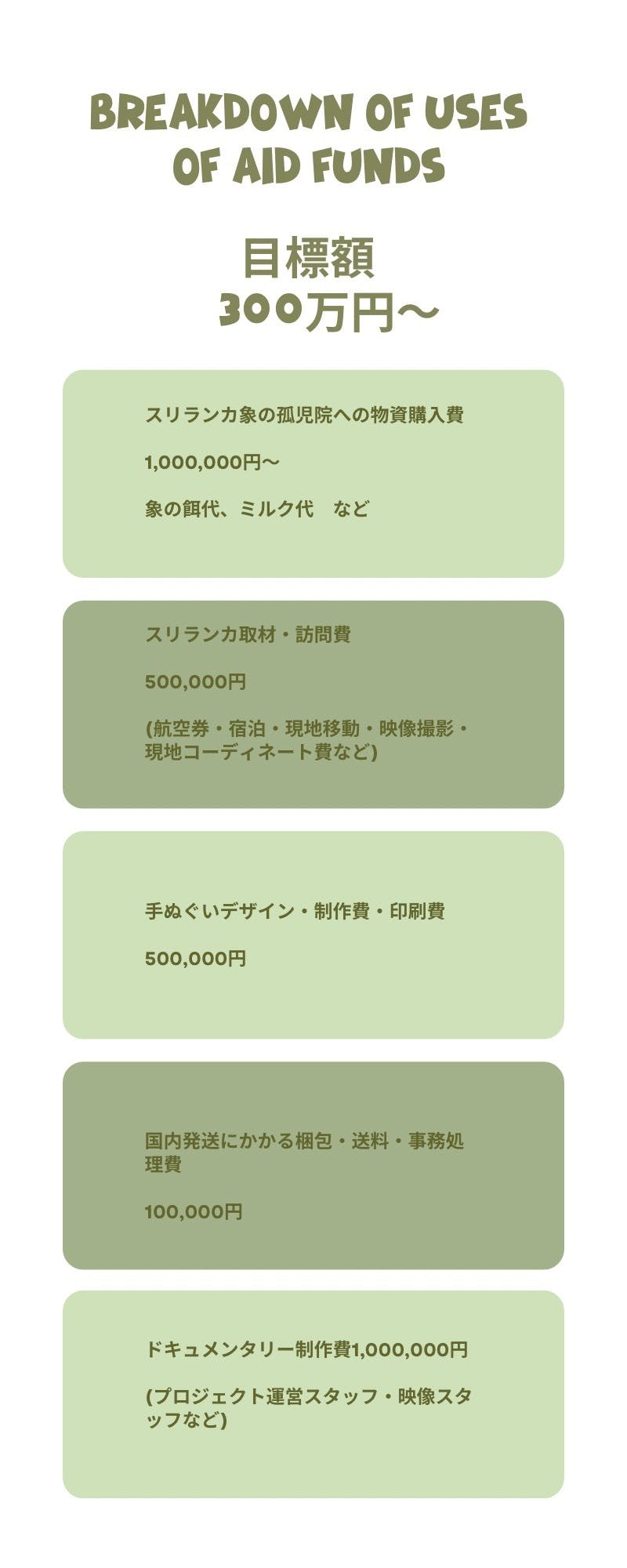 このプロジェクトでは、みなさまからの支援金のうち約3分の1を直接支援物資に充てることを前提に設計しております。