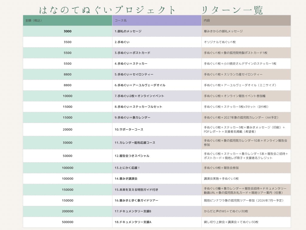 《象の孤児院へ・はなのてぬぐいプロジェクト》は、俳優・自然保護活動家の華みきが「スリランカの象の孤児院に支援物資を届け、その様子を記録したドキュメンタリー制作を目指す」チャリティー企画です。