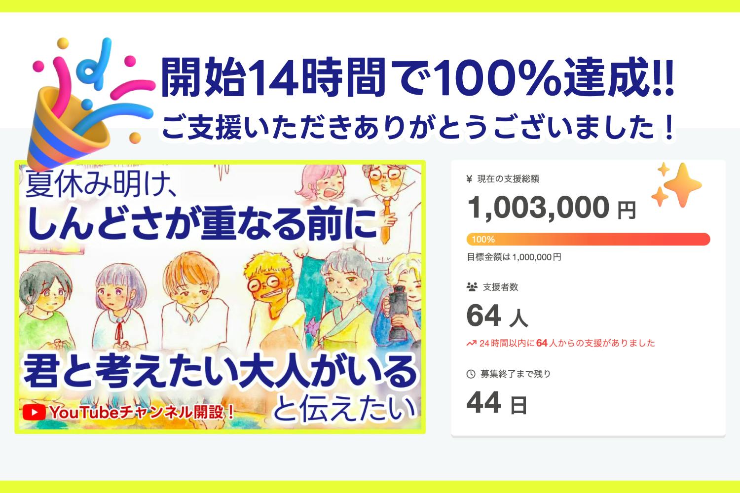 みなさまのお力添えのおかげで、開始から14時間にして、目標金額の100万円を達成することができました!