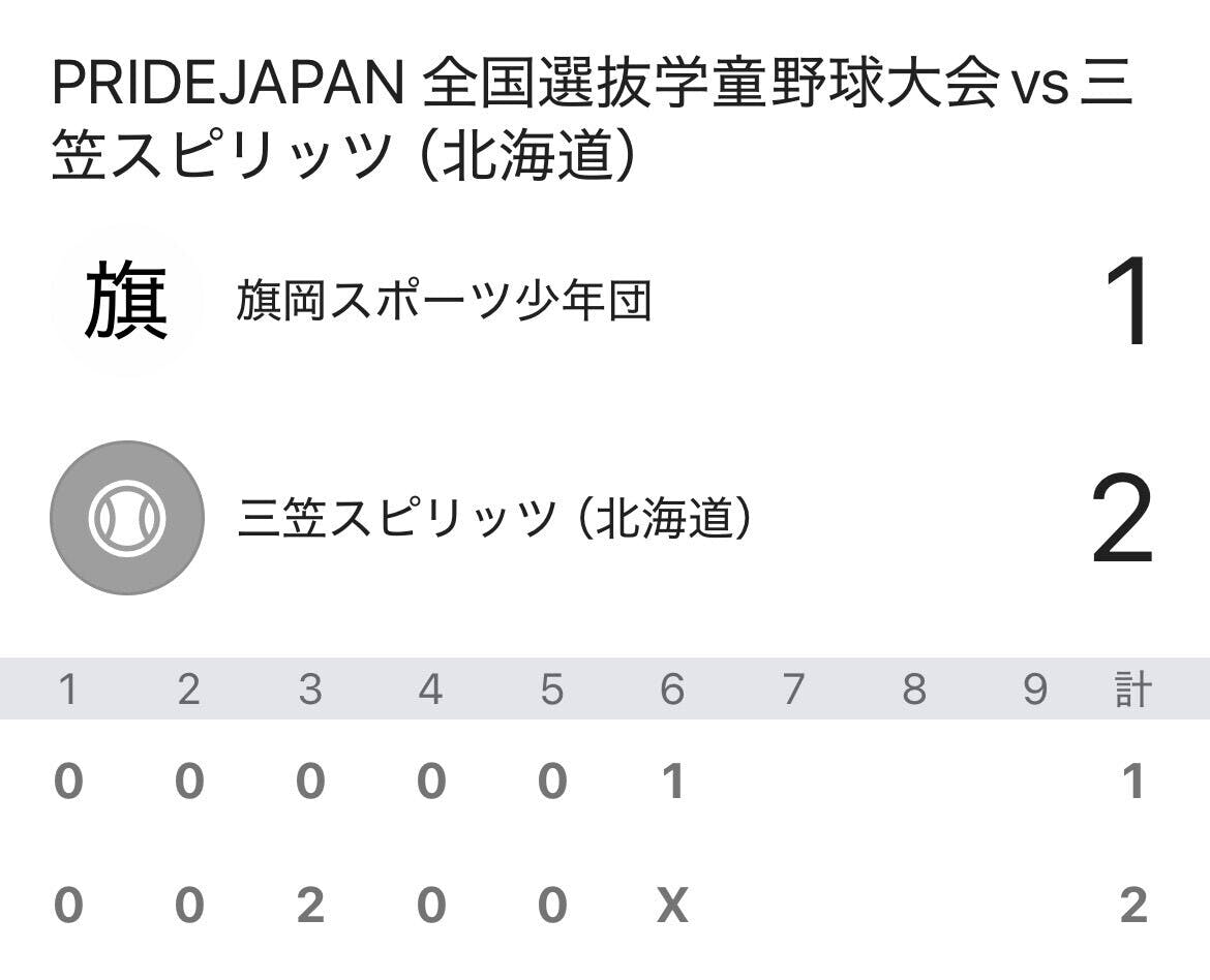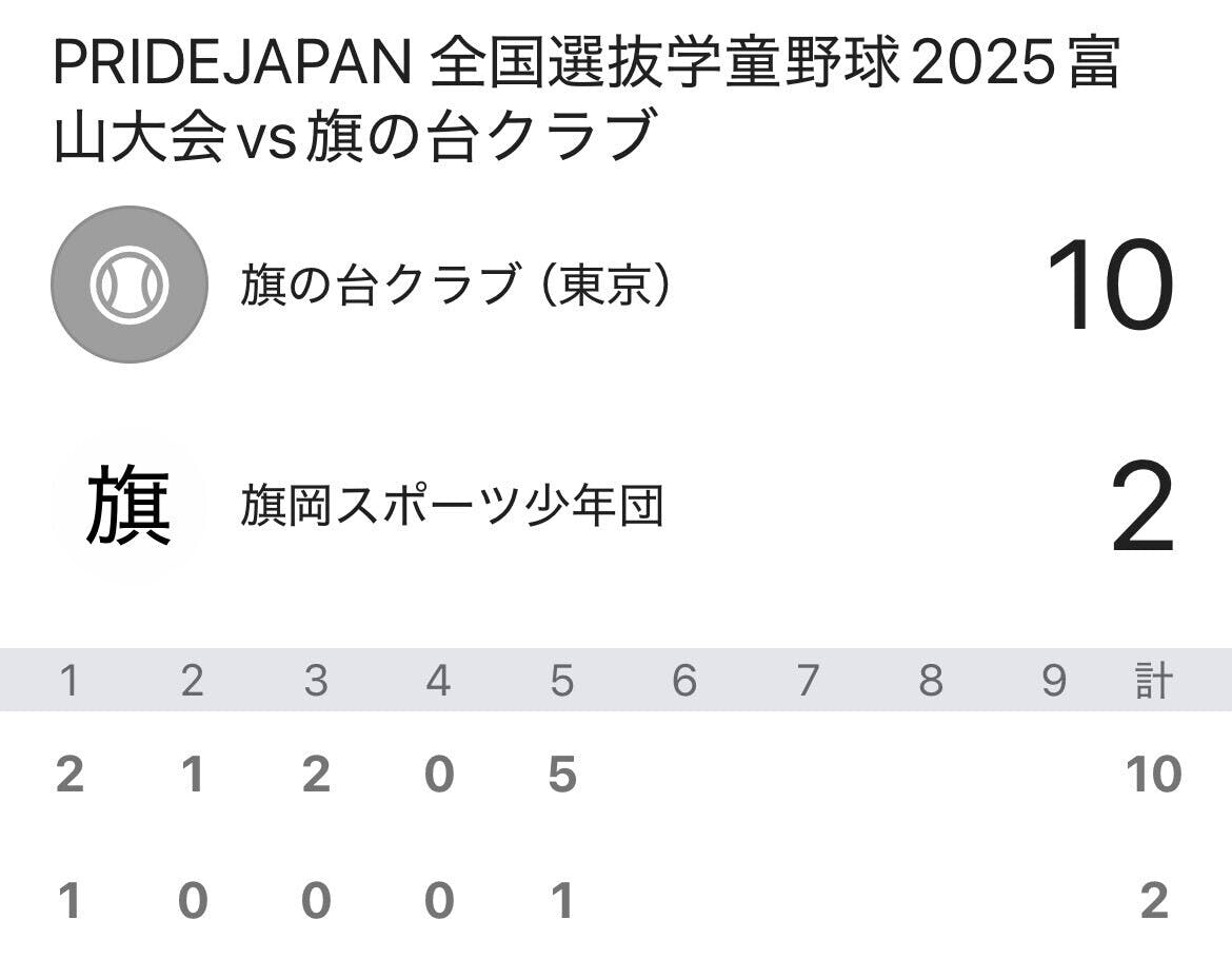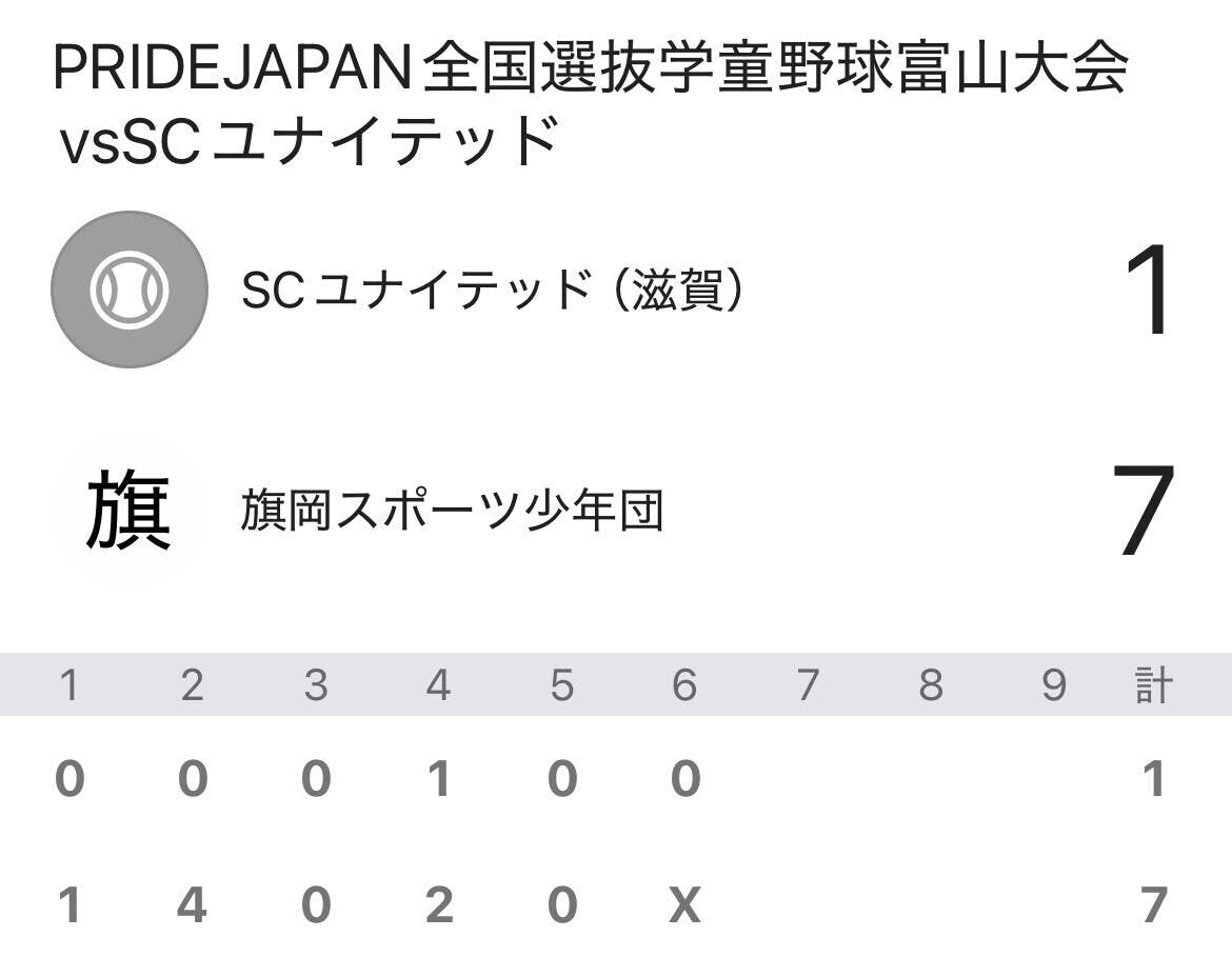 2025/08/17 20:22みなさま、こんばんは。本日でPRIDEJAPAN富山大会最終日となりました。試合の結果を報告させていただきます。本日は、惜しくもグループリーグ2位で敗退となりましたので、Eグループ2位の三笠スピリッツ様(沖縄)と交流戦をしました。結果は2-1で敗戦となりました。2点をリードされながらも最終回でチャンスを作り1点を奪いましたが、あと一歩届かず。。良い試合でした^^この試合をもって、2025”夏” 全国大会への挑戦は終わりました。改めまして、このクラウドファンディングを通して、旗岡スポーツ少年団を応援していただいた皆様に厚く御礼申し上げます。これまでの日々を思い返してみると、約2か月前にPRIDEJAPAN富山大会への出場が決まり、保護者・選手みんな大喜びでしたが、移動手段や宿泊の手配や諸々の準備や費用の捻出に奔走する日々でした。そんななか、このクラウドファンディングを通して温かくご支援していただいた皆様の優しさが本当にうれしかったです!!たくさんの応援コメントもいただき本当に感謝いたします!子どもたちは、全国大会でも物怖じすることなく、自分たちの力を発揮してくれました。この大会でつかんだ1勝の価値はとても大きいと思います。グループリーグ2位に胸を張って帰ります。これからも、山口県下松市の旗岡スポーツ少年団を応援してください!野球が大好きな純粋な子どもたちが一生懸命頑張ってます^^重ね重ねになりますが、本当にご支援いただきありがとうございました。 もっと見る