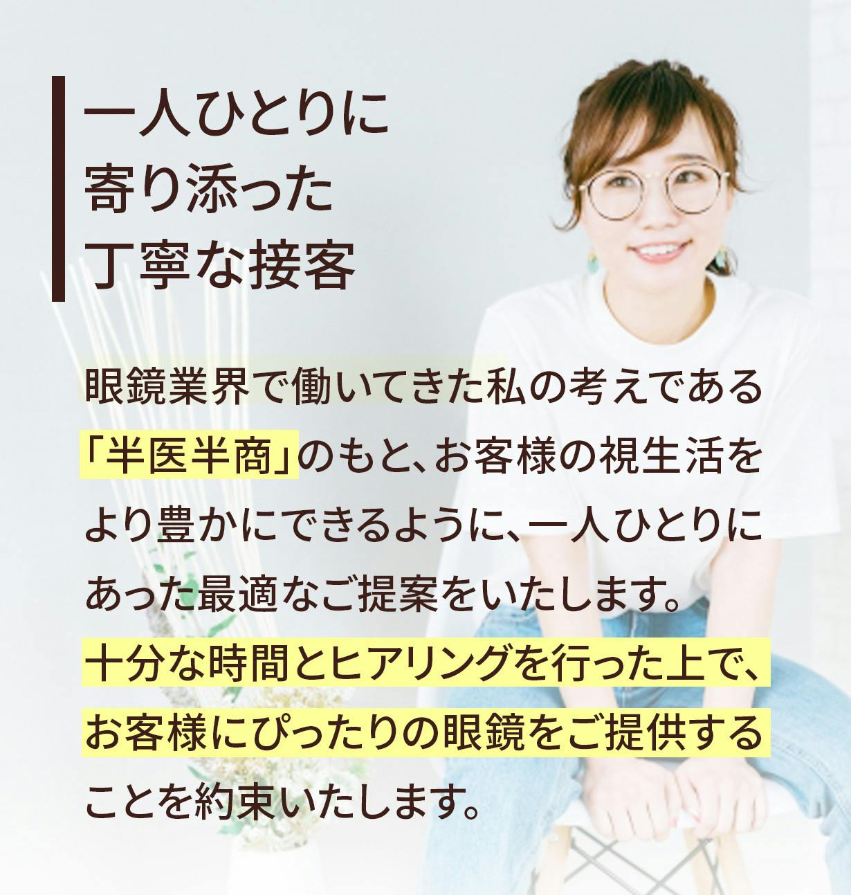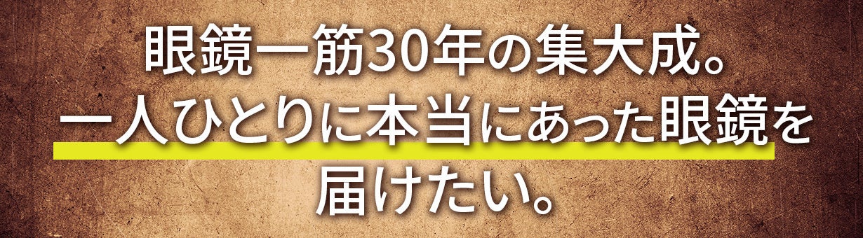 本店舗は、約30年間、眼鏡業界で経験を積んできた私が、“お客様にとって、生活が豊かになる眼鏡は何か?”を真剣に考えた上で生まれたお店です。