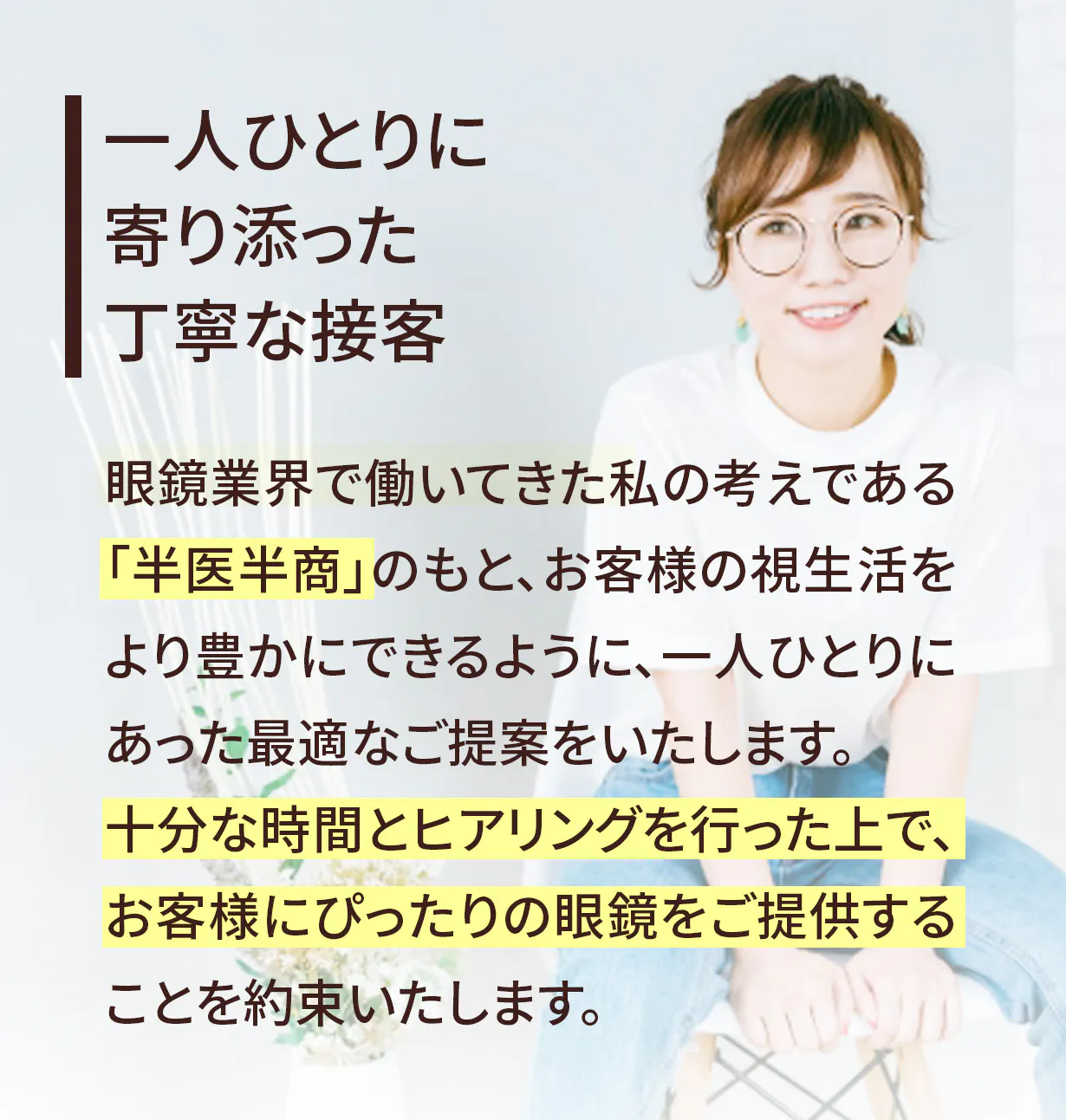 私はこれまで約30年、眼鏡という商品を通して「お客様一人ひとりに最適なご提案をすること」を学び続けてきました。