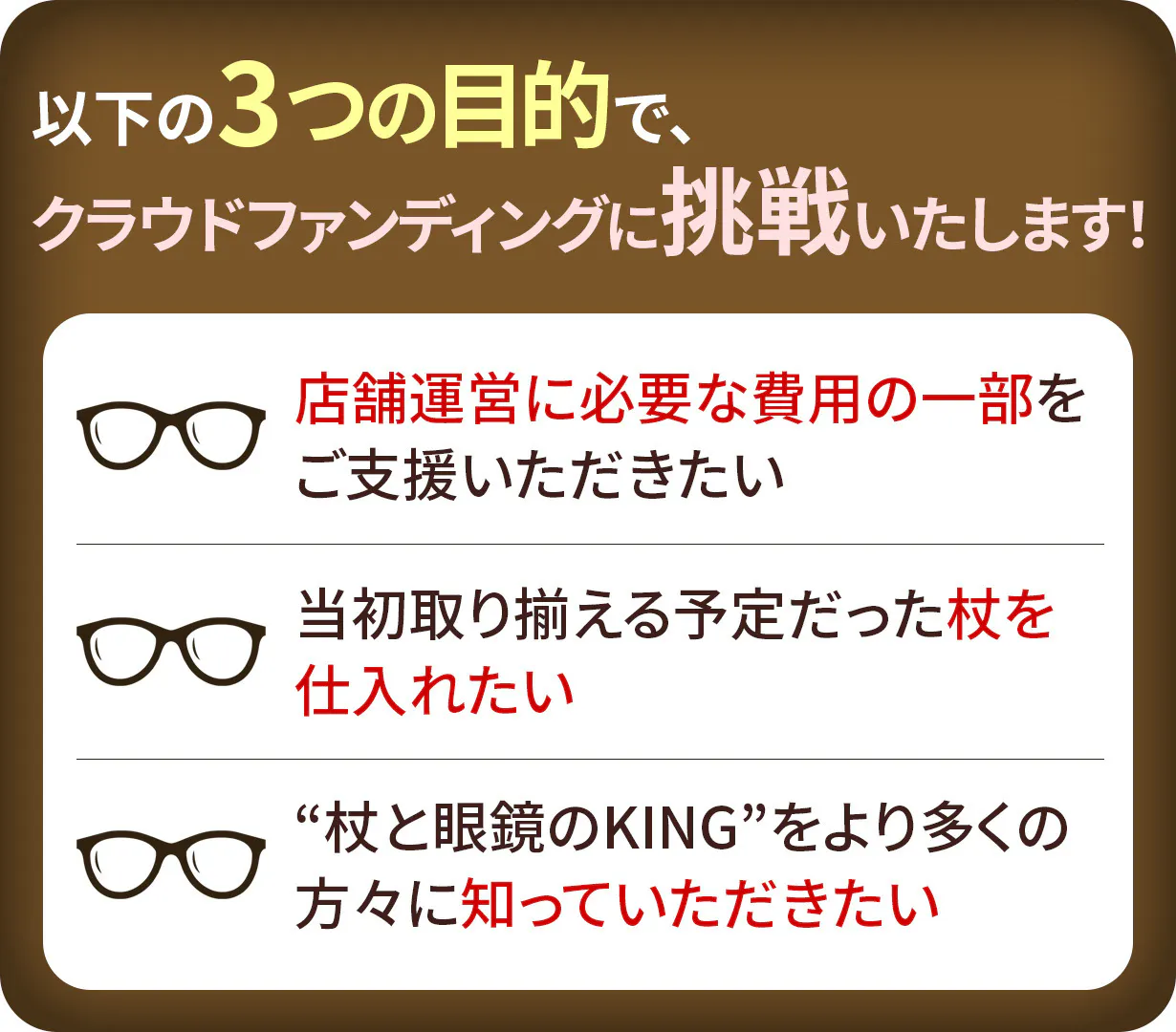 そして、今回のクラウドファンディングを通じて、より多くの方々に杖と眼鏡のKINGを知っていただける機会になると嬉しい限りです。