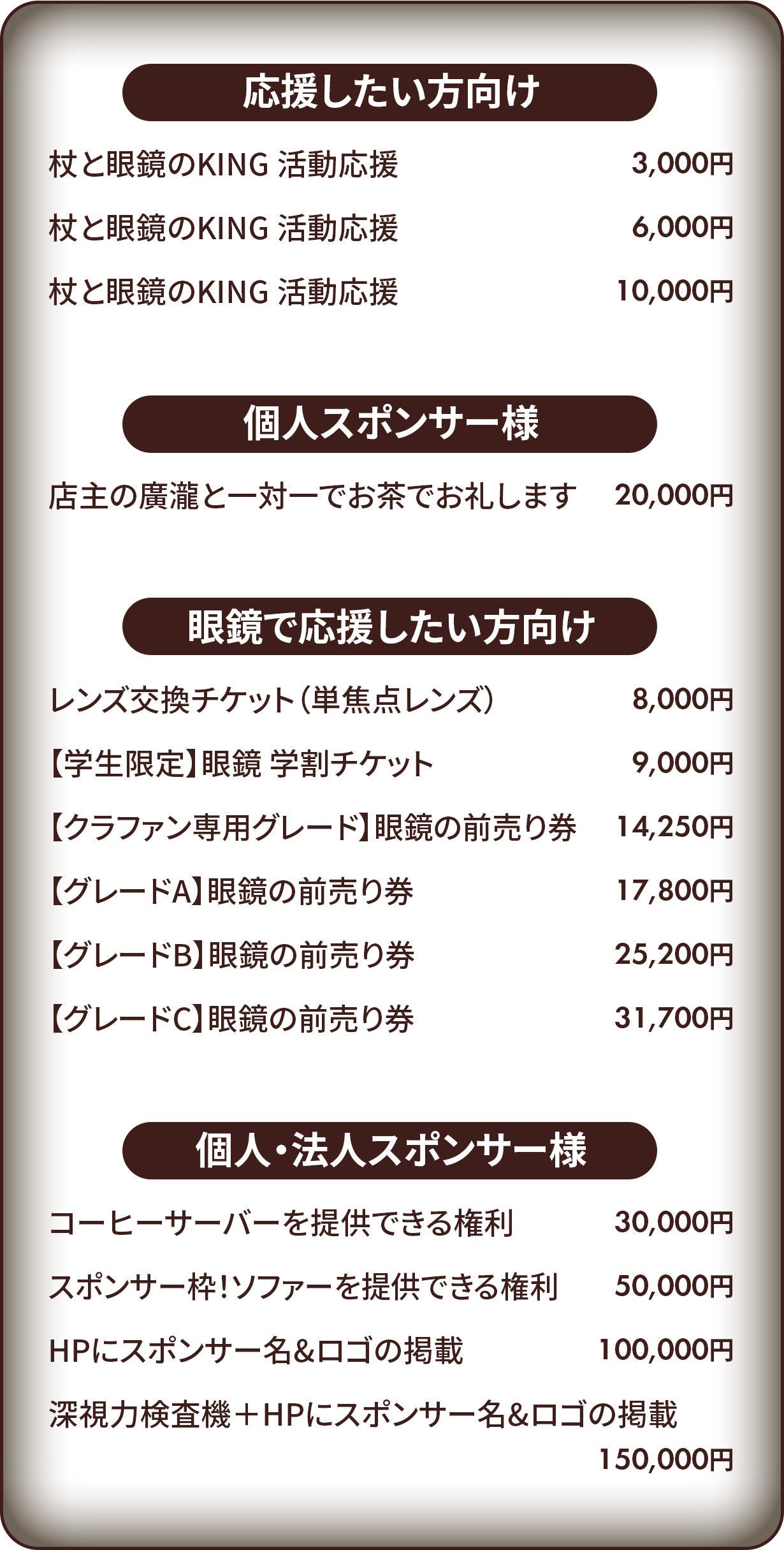 杖と眼鏡のKINGを通じて、より多くの方々の眼生活を豊かにすることができると確信しておりますので、ぜひ、本プロジェクトページをご覧いただき、多くの方々にご来店いただけますと嬉しい限りです。
