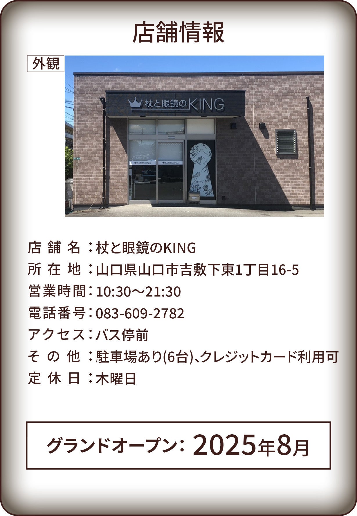 杖と眼鏡のKINGを通じて、山口県の皆様へ“本当に快適で、自分に合った眼鏡”を提供し、皆様の視生活をより豊かにしたいと思っております。