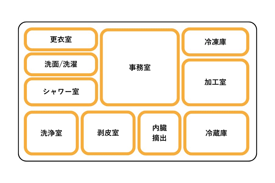 施設は右手前から洗浄室、左手前が更衣室、洗浄室、ロッカー室です。