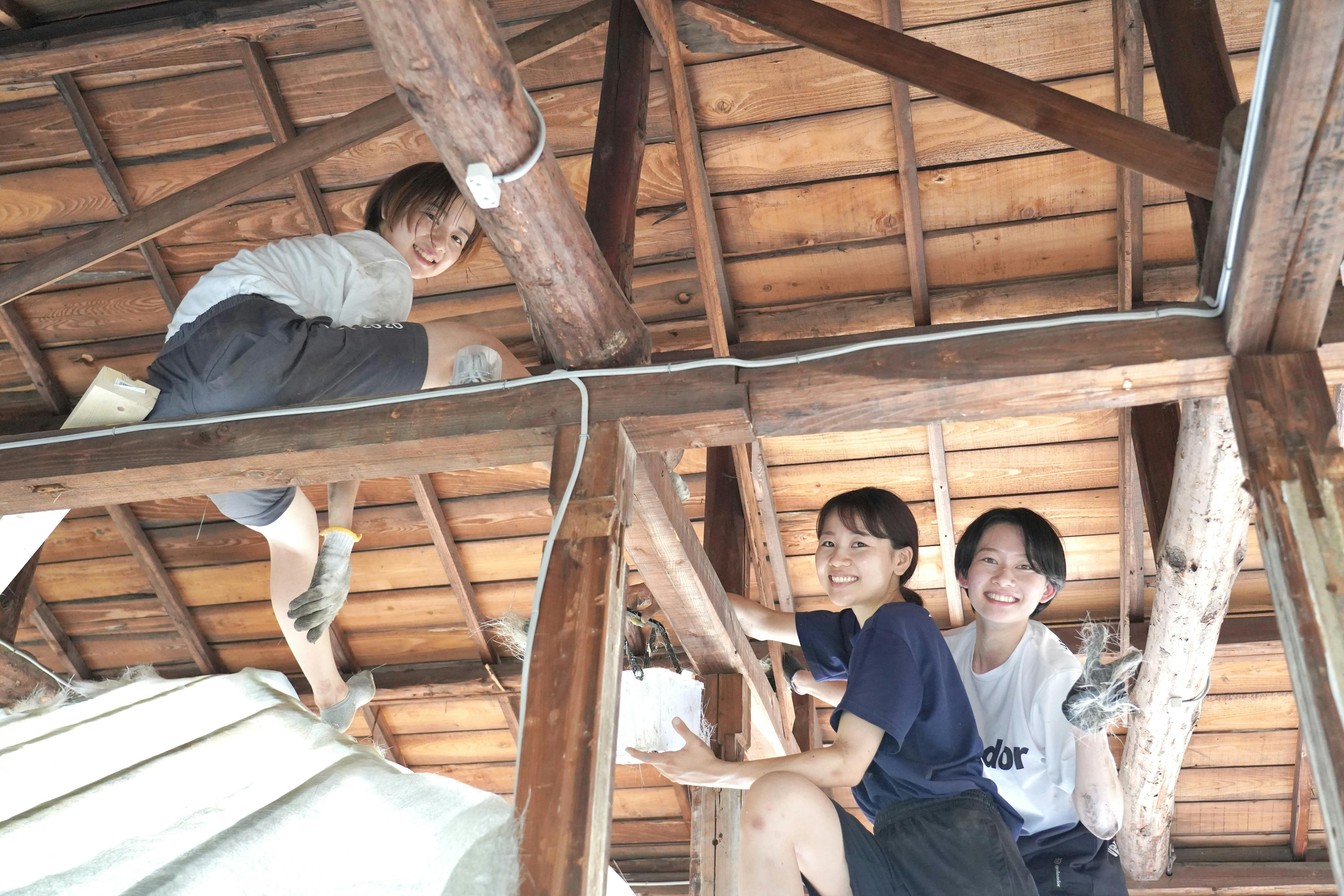 • クラウドファンディングを終えて、10日間が経ちました。新店舗を構える月見台住宅でDIY作業をし、工房で製造しに焼きに戻り、を繰り返しています。先日、都内を歩いていたら、クラファンでご支援いただいたリピーターさん3名に遭遇!普段、東京にいる時、顔見知りの人に会うこともほとんどありませんが、感謝の気持ちを直接伝えることができ、タイミングにも不思議な縁を感じた出来事でした。工房は、着々と完成に近づいています。今日は、DIY作業の山場の様子を記しておきます。vol.1からその様子をお伝えしてきた工房のDIY。建築士さんと協働し、木材の買い出しから、採寸、カット、ビス留め、組み立てまで行う、かなりハードなセルフビルドです。透明のフィルムの上から、さらにガラスフィルム貼り+FRP塗装。最難関だったのは、工房の骨組みに張り付けた透明のフィルムの上から、さらに気密性を高めるためのガラスフィルム貼り+FRP塗装をする作業。この日はちょうど、建築士さんや姉、妹、リピーターさん、友人たち、たくさんのお手伝いに恵まれた日でした。山場になることを、予期していたみたい。ガラスフィルムまずは、ガラスフィルムを張っていきます。このガラスフィルム、特別な塗料と合わせることでプラスチックになる素材で、チクチク刺さる上に、破れやすい。気を付けて扱わなければなりません。一人が屋根の上に上り、もう一人がガラスフィルムを上に渡し、さらにもう一人、上に渡す分のガラスフィルムを破れないようにそーっと巻を解いていく、3人がかりの作業。しわのないように、かといって張りすぎて破れないように、慎重に伸ばして位置を決め、タッカーというホッチキスのような工具で留めていきます。ガラスフィルムをタッカーで留めていきます。ガラスフィルムを全体に貼ったら、次はFRP塗装。何かと何かの液体を混ぜ合わせ、プラスチックのもとになる塗料を作ります。(液体の名前は忘れました。)この塗料、手に触れると痛痒くなるので要注意。下で塗料を作る人、中継する人、塗る人、皆で分担して作業しました。真夏で、冷房のない部屋なので(冷風機をがんがんにつけています)、体感43℃くらい。上部で塗っている人が一番体力を奪われるので交代しながら、工房の屋根部分によじ登り、工房の梁のすすで腕は真っ黒に。スポーツ女子の妹、大活躍。硬化するとプラスチックになる液体。皮膚に触れると痛痒く、熱くなるので要注意です。梁に座りバランスを取りながら、ハケで塗っていきます。下の写真のように、足の間からかがみ込んで塗る箇所も。体幹と柔軟!と言い聞かせ、中高時代に打ち込んだ部活動を思い出していました。体幹と、柔軟性!作業終盤、少し疲れ気味?でも達成感に満ち始めた時。手伝いに来てくれた、姉と妹。三姉妹で協働する場所があり、それを支えてくれるたくさんのお手伝いがあり、楽しみながら作業を終えることができました。汗だくになりながら楽しそうに、作業後は充実した表情を向けてくれて、明日のがんばりをチャージしています。お手伝いしに来てくださる皆さん、メッセージをくださる皆さん、本当にありがとうございます!今週末も、店舗作りを進めてきます。次回は、DIYワークショップで行った、壁面塗装についてお伝えします!写真提供:櫻井上総(Instagram@kzsskri) もっと見る