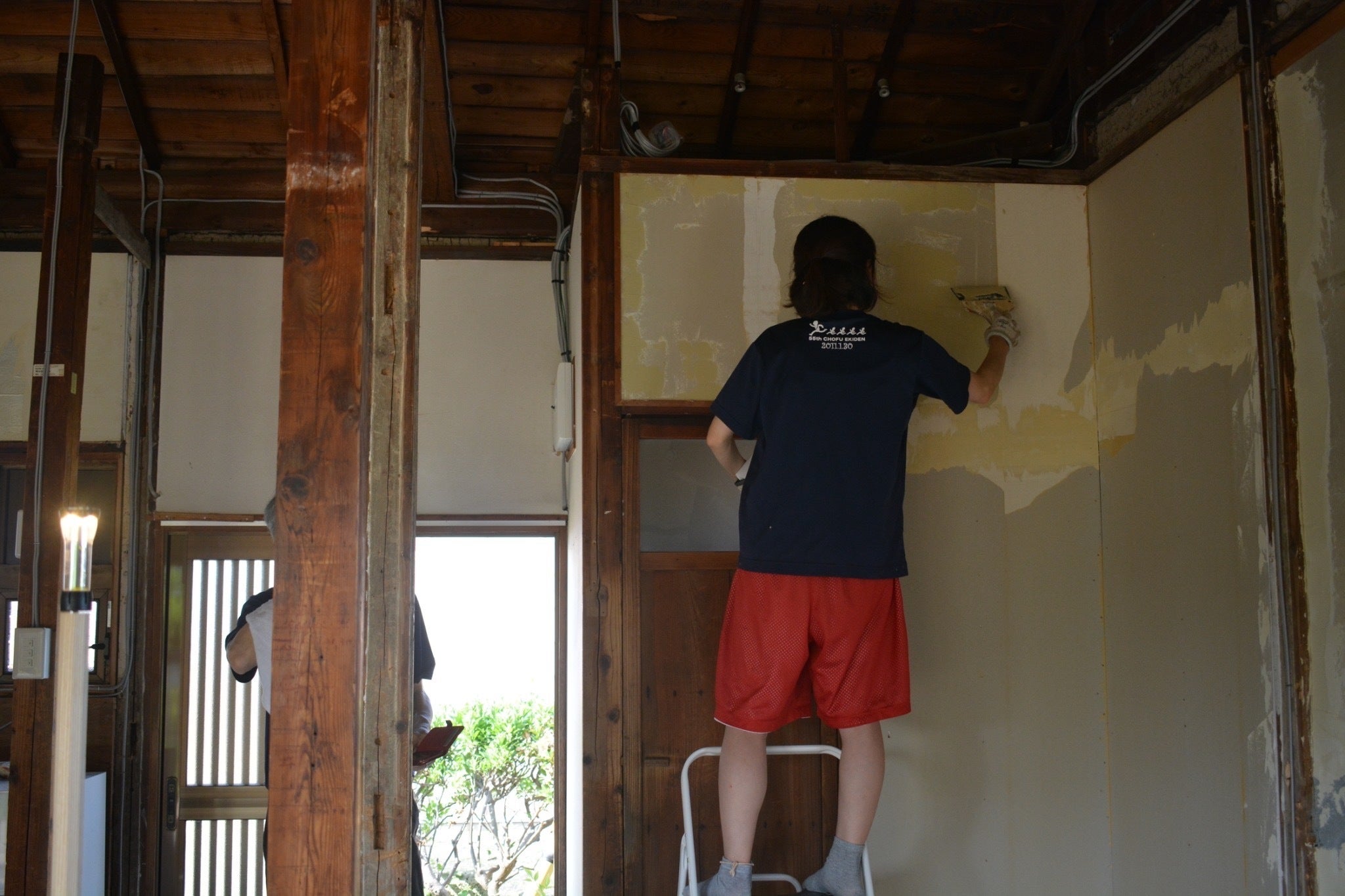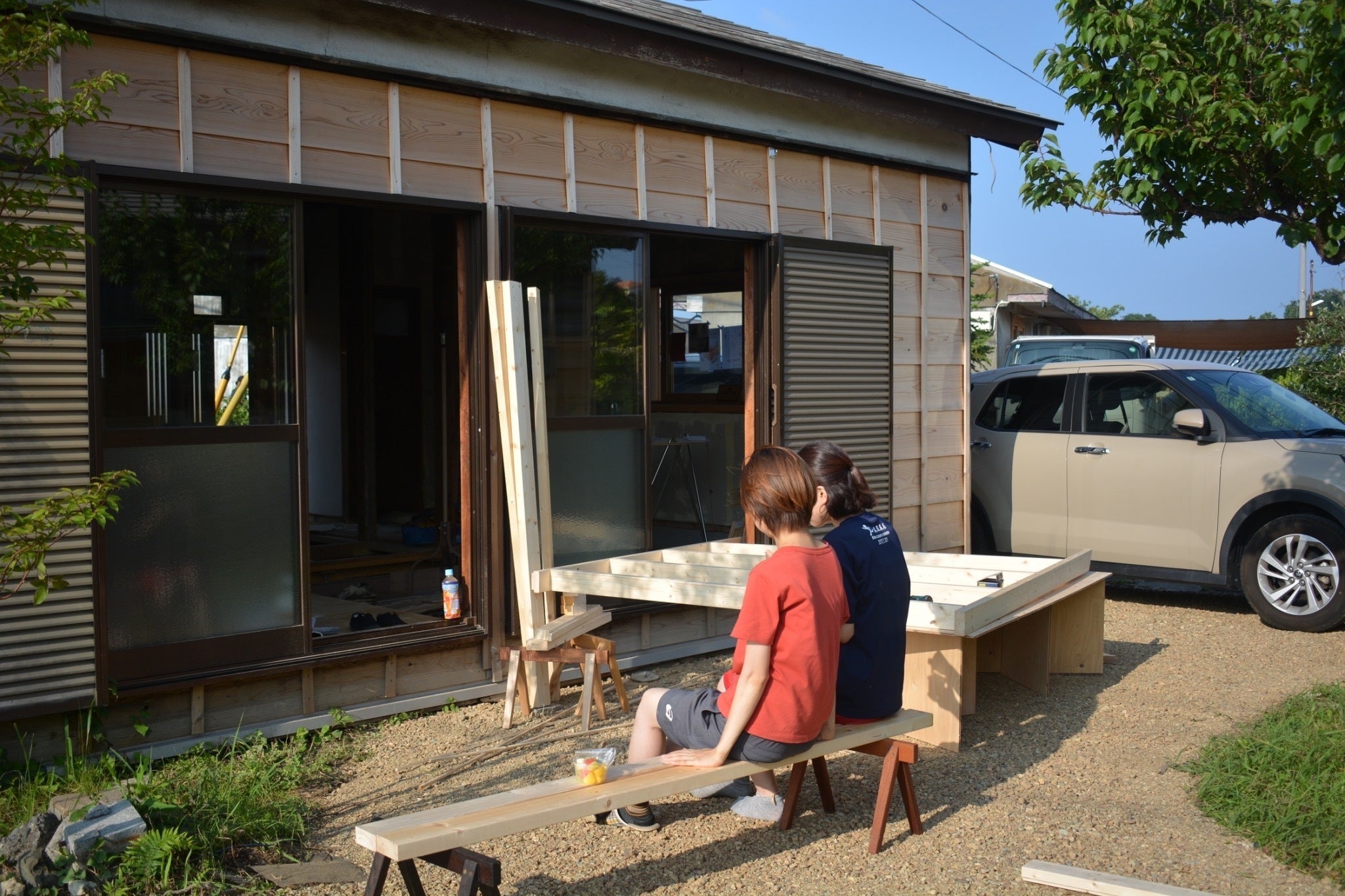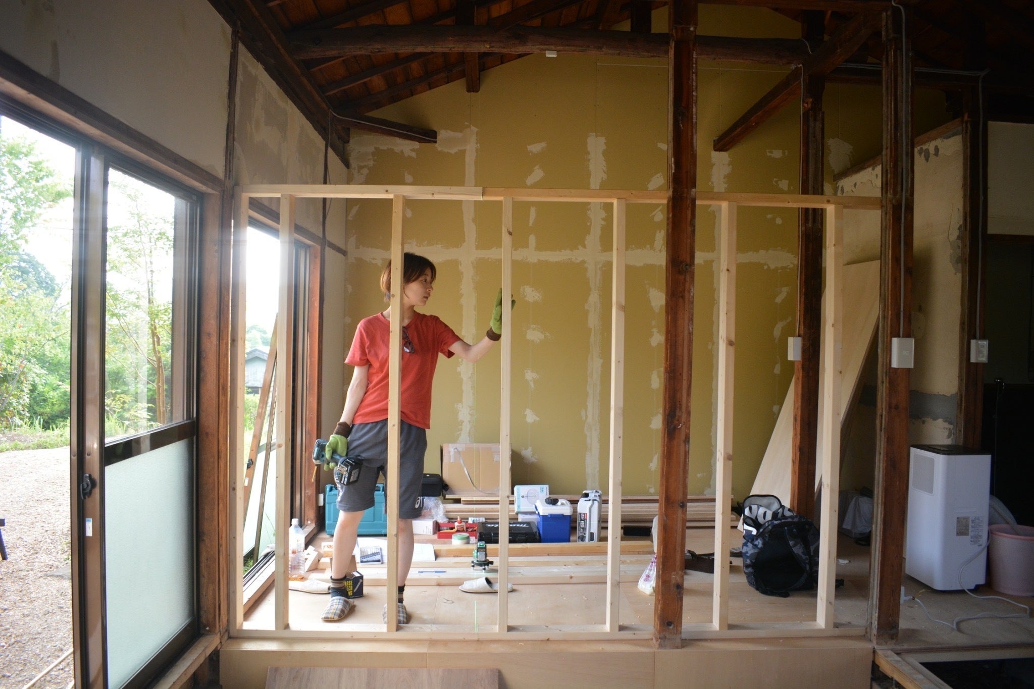 DIYのスタートは、建築士さんから丸鋸の使い方を教わったり、これから使っていく作業台を作ったり。古民家ならでは、補修が必要な部分も多くパテ作業を行ったり。