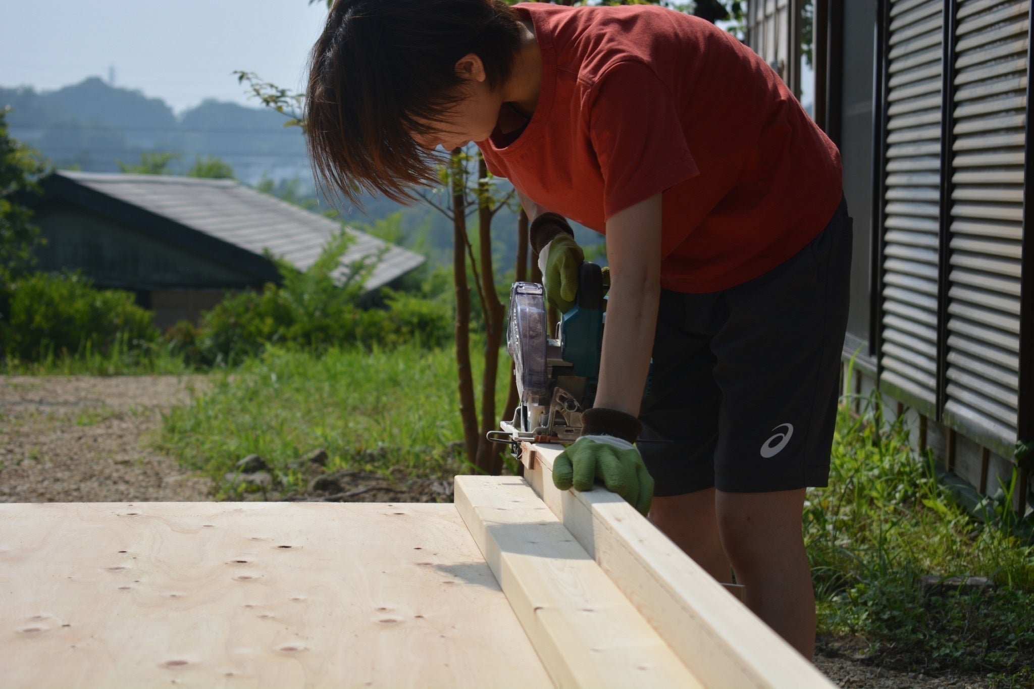 工房の骨組み部分は、まず木材を買い出し、カットするところから。丸鋸の使い方すら知らない素人の私に、建築士さんがひとつひとつ教えてくださいました。今では丸鋸もすんなり使うことができますが、重大な怪我につながる機材なので慎重に、油断せず!調子に乗るな!と自分に言い聞かせながら。