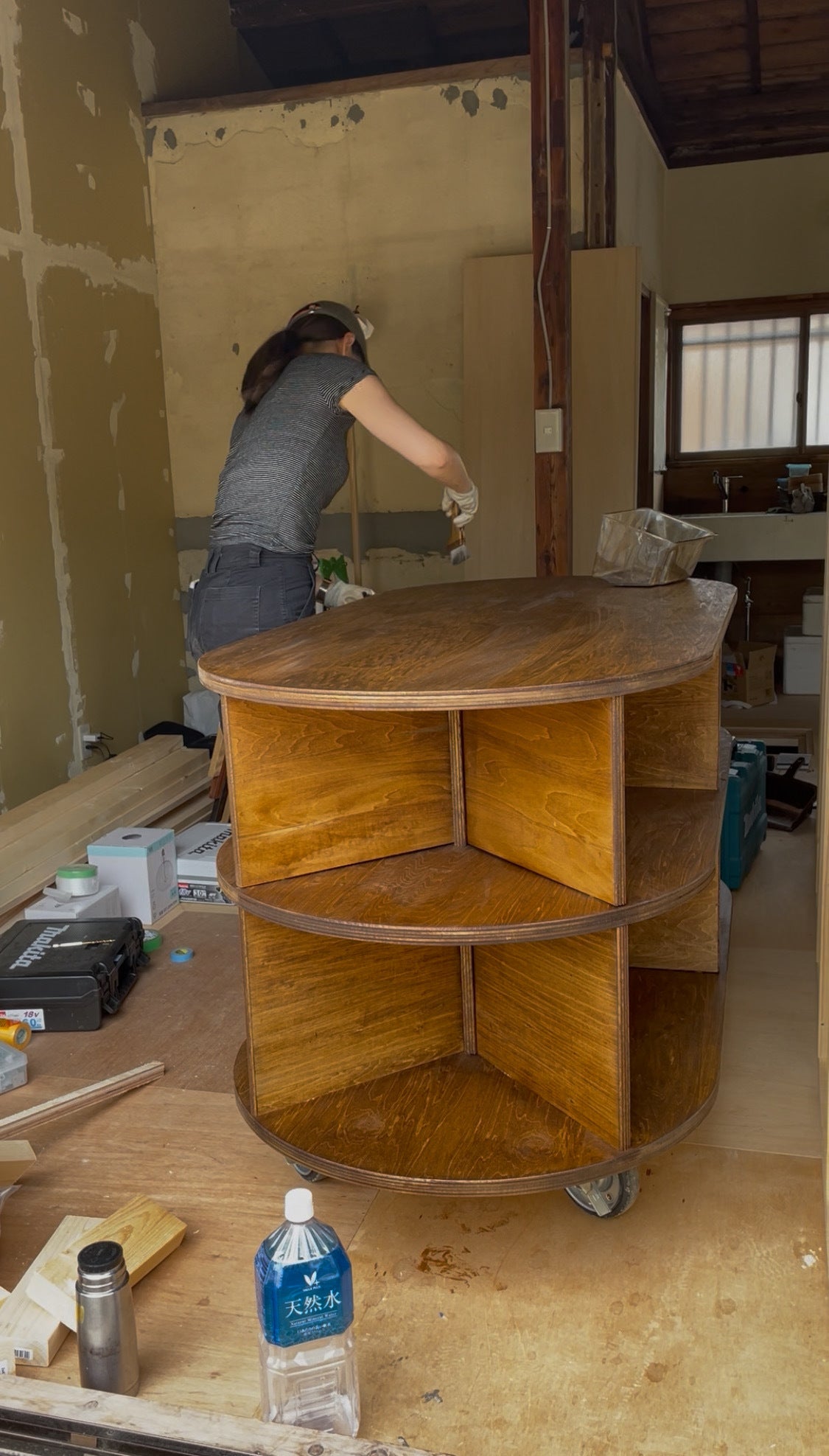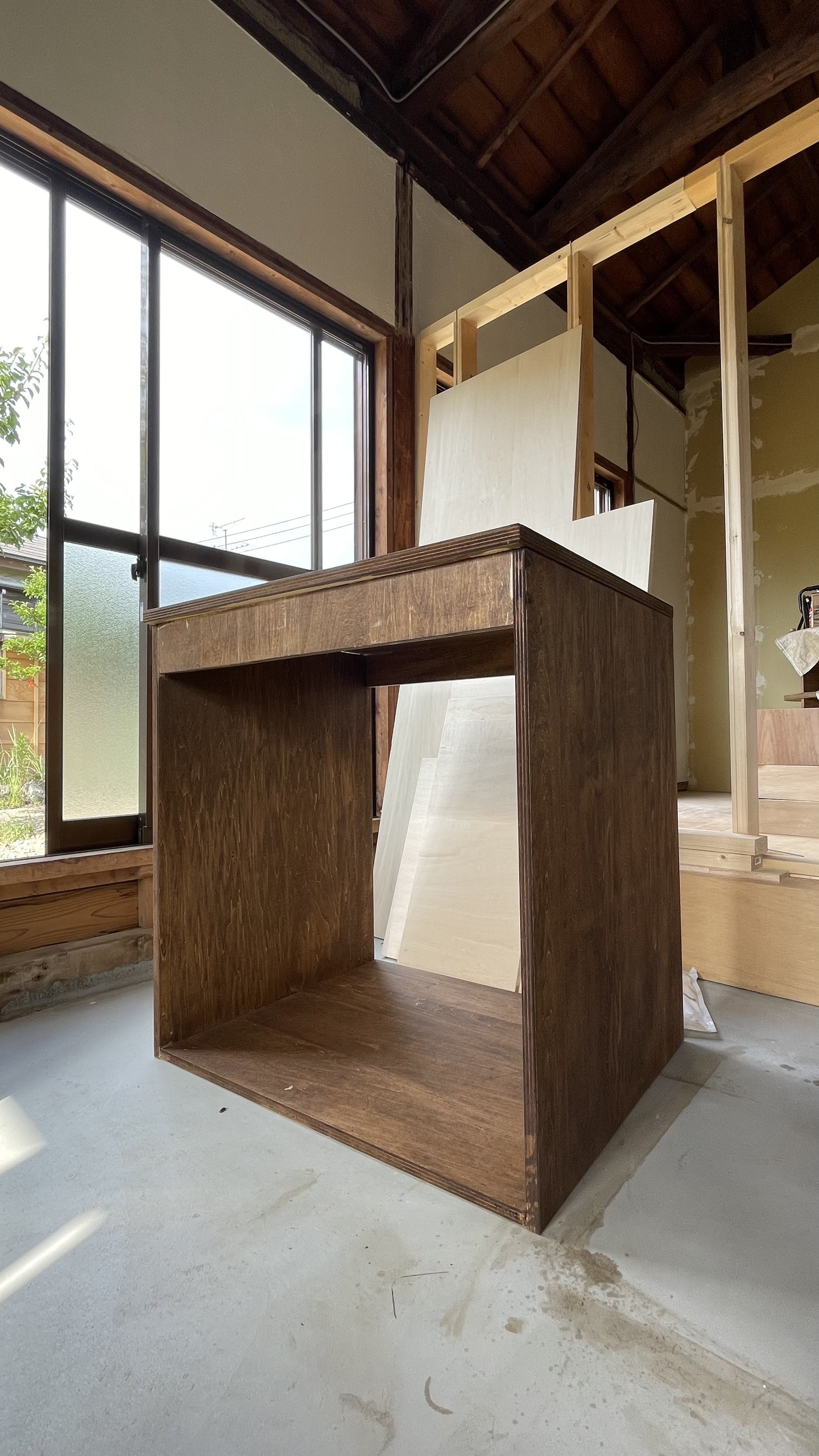 シンクカウンターは、今週末、オイル塗装をする予定です。造作家具ができると、いよいよ"工房"感が溢れます。