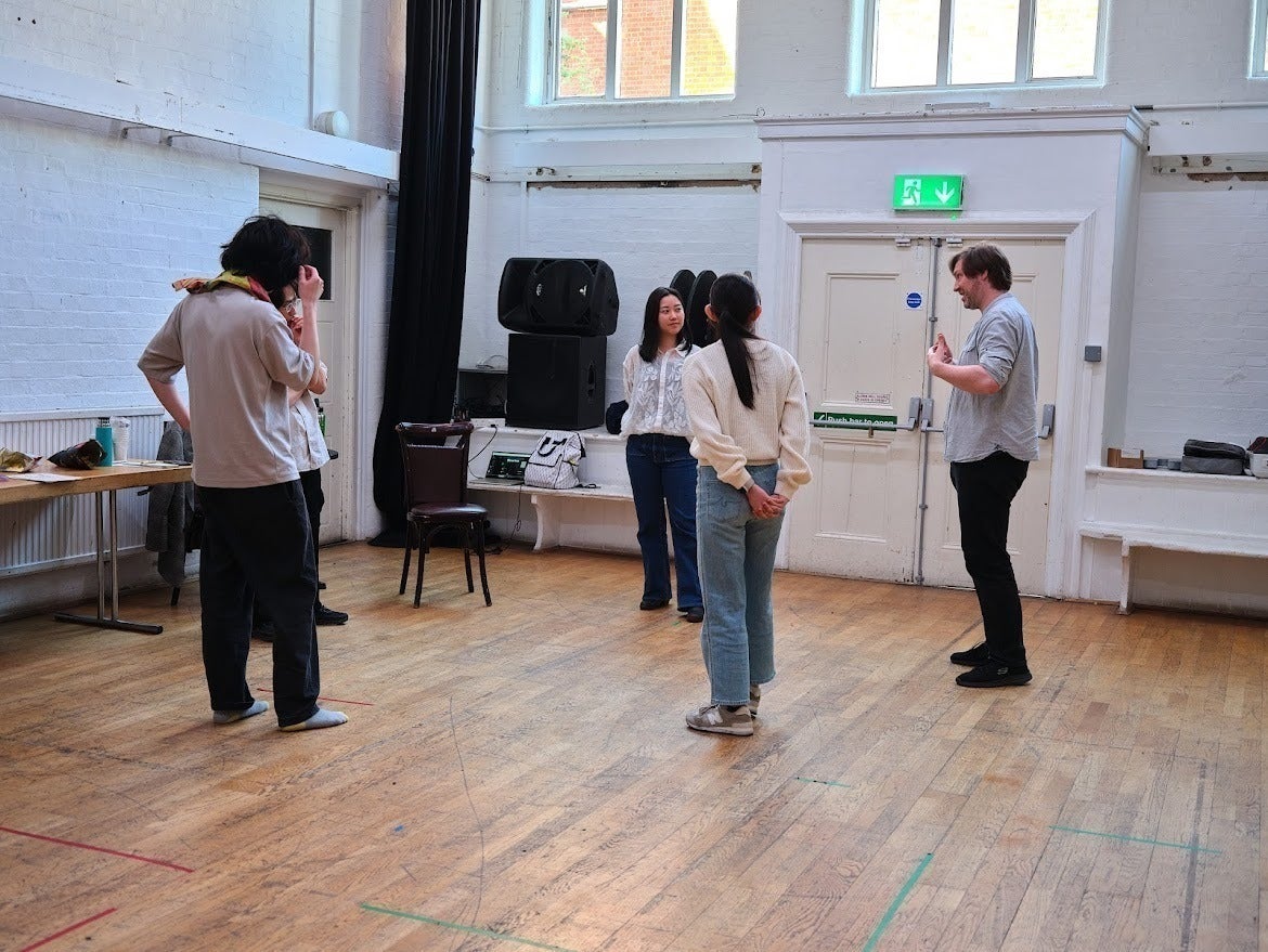 2025/08/13 09:06こんにちは!Unboxing Theatre代表の佐藤です。稽古も残すところ、あと4日となりました。この2週間で新しいクリエイティブメンバーが3人も加わり、プロジェクトが急激に大きくなっていることを実感しております。みんな本プロジェクトに興味を持ってくれて有志で参加してくれおり、本当に感謝しきれません。舞台セットはもちろん、曲もゼロから作っており、また振付師やテックオペレーターも参加しています。写真は、先日のボイスコーチによるセッションの様子です。イギリスでは稽古場にボイスコーチと呼ばれる人を入れて、声の出し方や英語の発音などを手助けしてくれます。写真に映っているのは私、佐藤と、出演者の一人Nobuo Otsukaさんです。次回は、皆さんのご支援のおかげで出来上がってきた舞台セットを公開しようと思います。皆様引き続き、ご支援および拡散のほどよろしくお願いいたします。 もっと見る