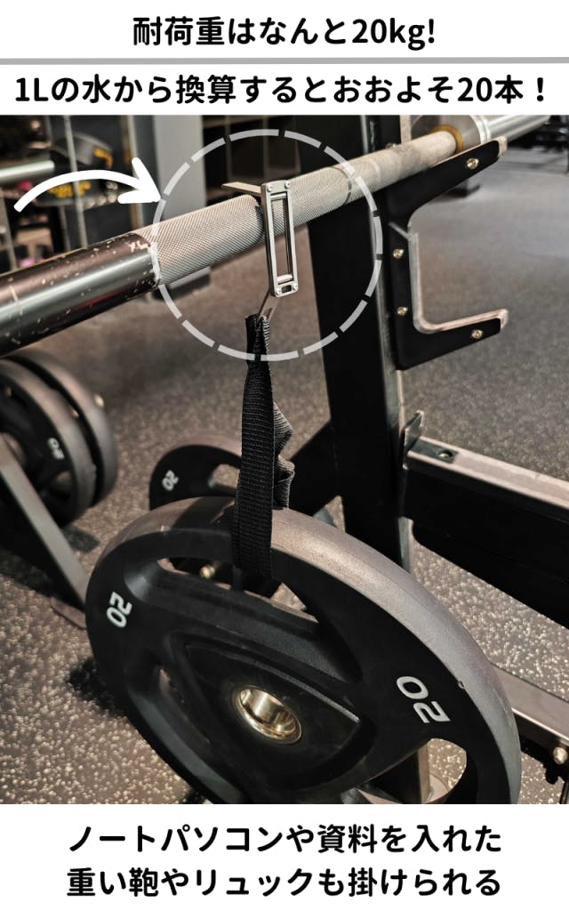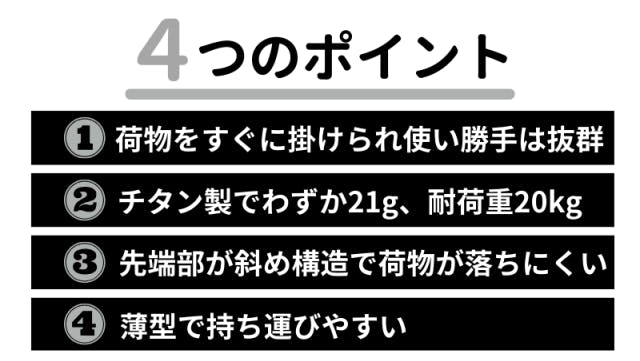 チタン製で強度が高く、自分の荷物だけでなく、家族や友人の荷物も一緒にかけられます。
