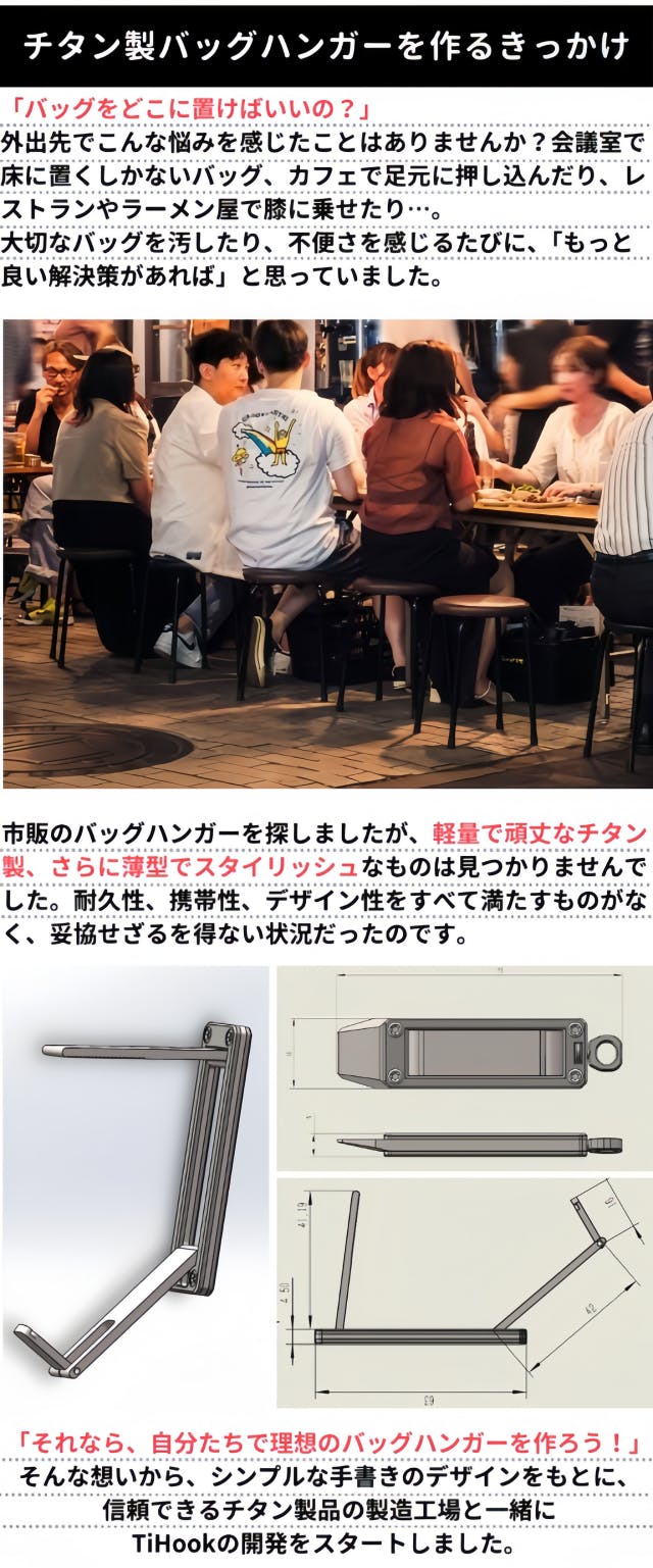 デザインや機能性のどちらかを妥協せざるを得ない現状に、私たちは「理想のチタン製バッグハンガーを作りたい」と決意しました。