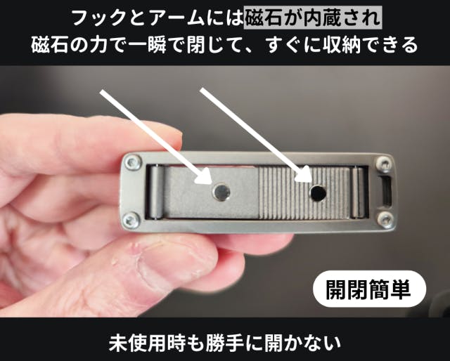 TiHookは使用後の収納も超簡単、磁石の力で瞬時に閉じることができます。
