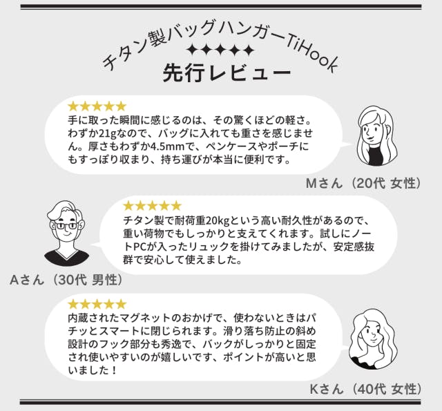 市場にはさまざまなバッグハンガーがあるものの、軽量で頑丈なチタン製、薄型でスタイリッシュ、さらに使い勝手の良いものはなかなか見つかりませんでした。