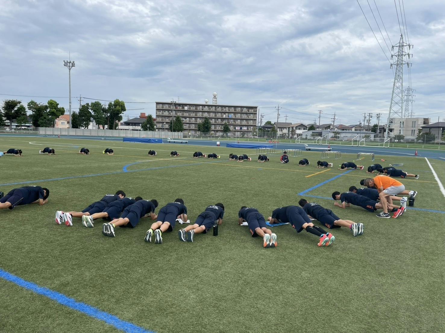 今日の練習は、中学生クラブ生と一緒に競技場で行いました。