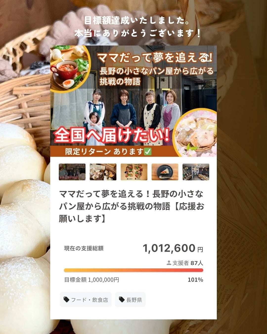 この度は、私たちの「長野の小さなパン屋から広がる物語~ママ達のパンを全国に届けたい!~」に温かいご支援を賜り、心より御礼申し上げます。