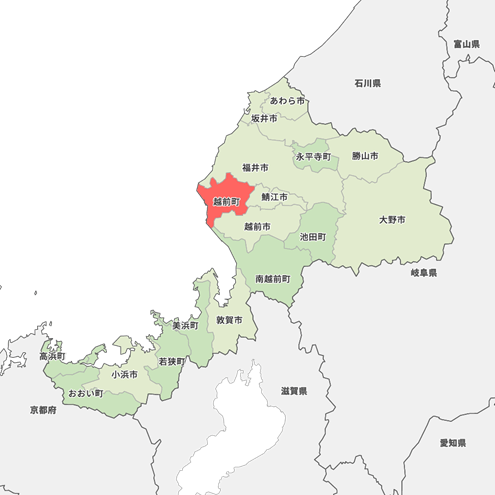 2005年に4つの町村(朝日町・宮崎村・越前町・織田町)が合併し、誕生しました。