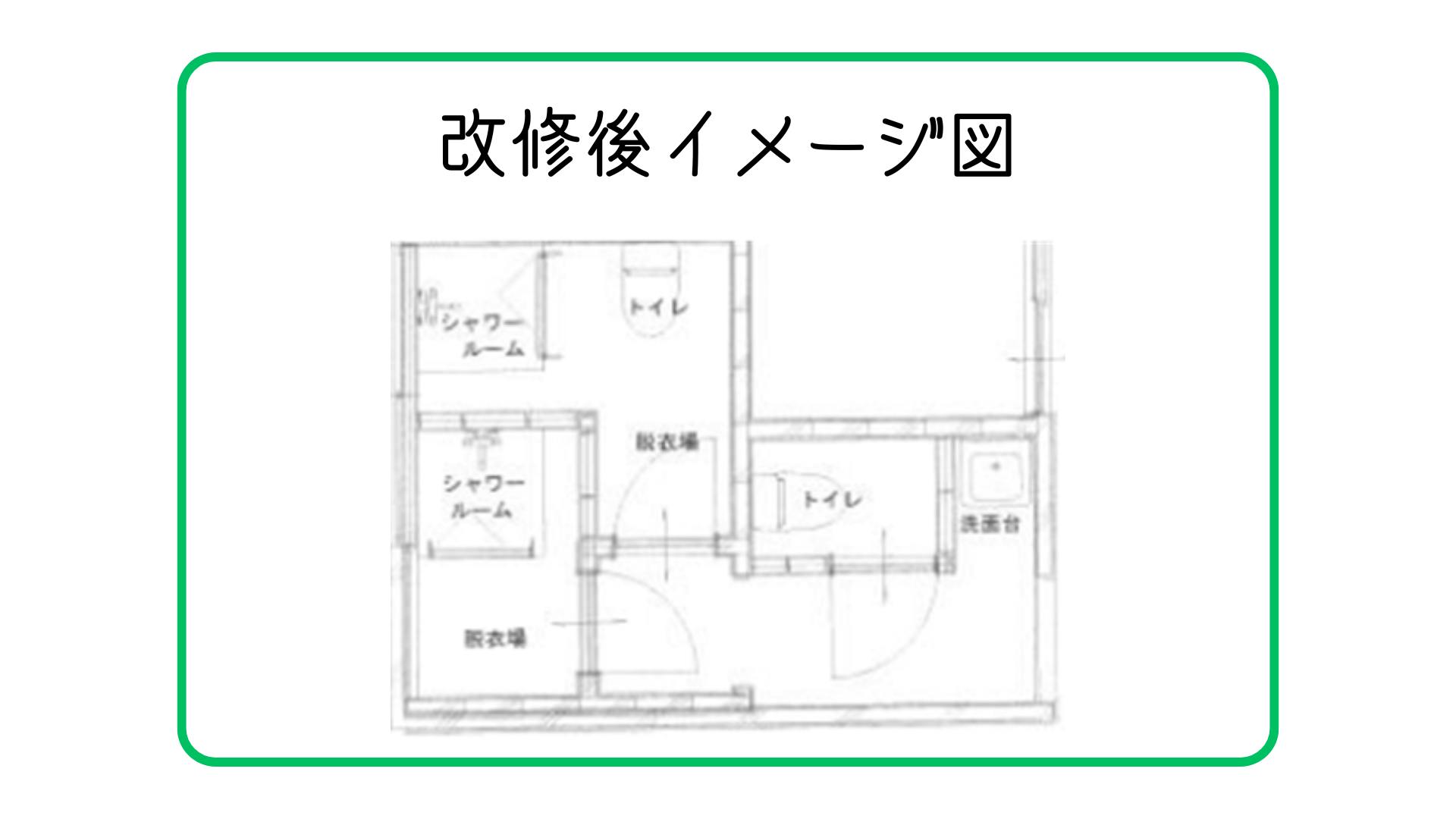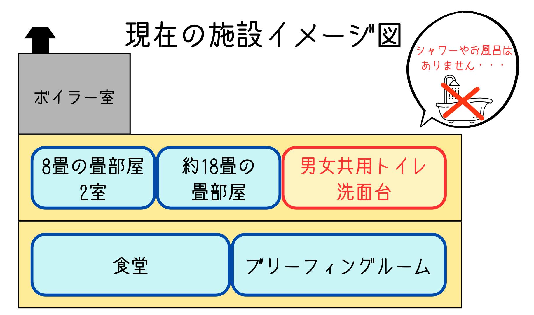 しかし、当施設はもともとドライブインという名目の建物を再利用しているため、お風呂やシャワーといった設備がありません。さらに、トイレは男女共用、更衣室もないといった状況です。