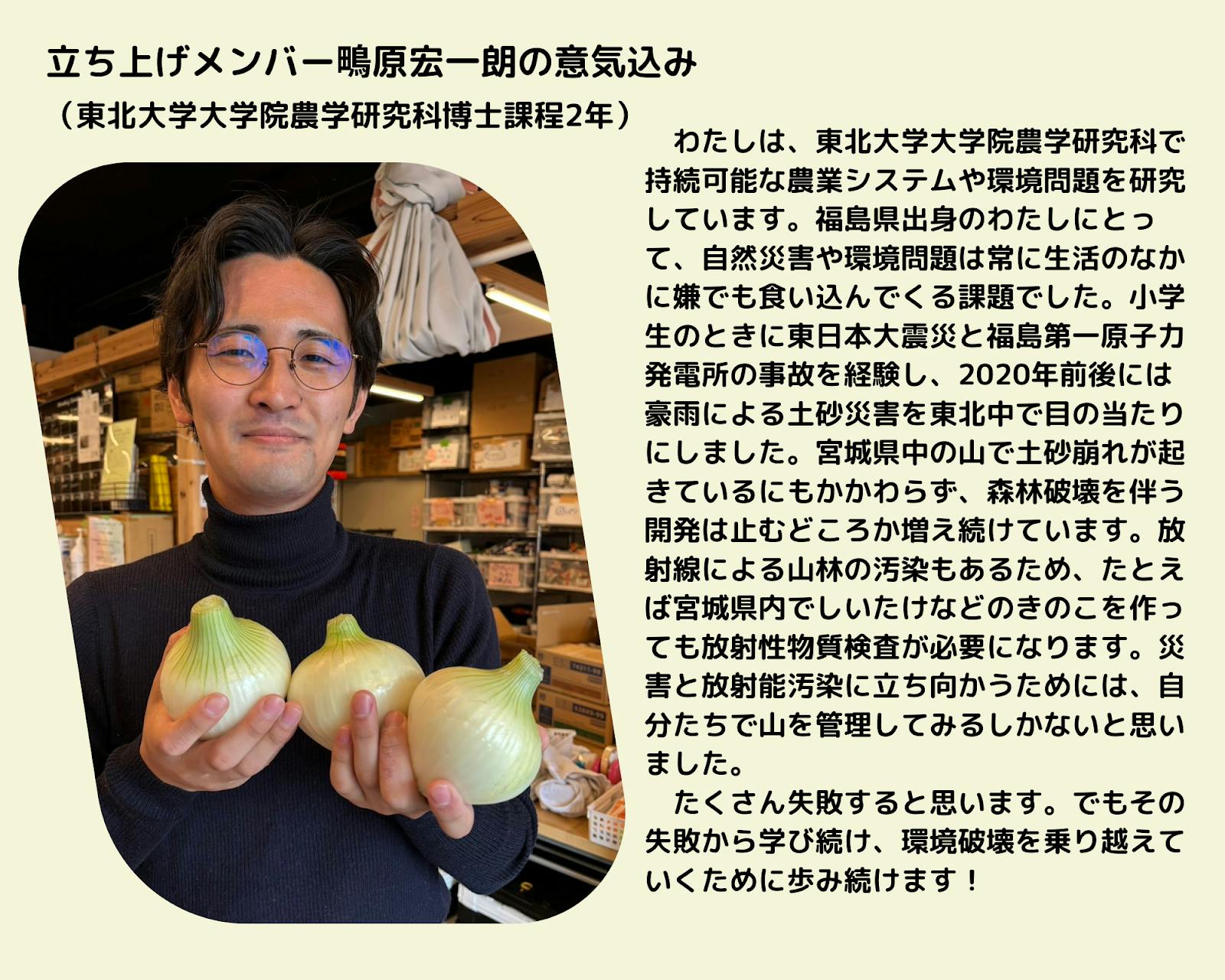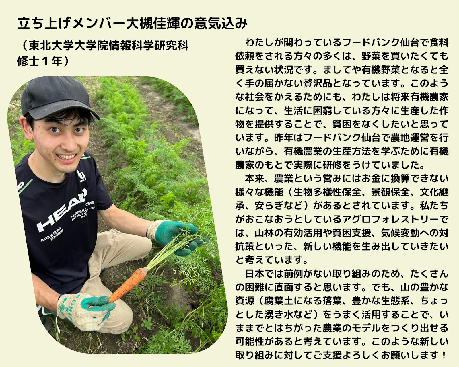 今回のプロジェクトは、伐採が進む森林を守りたい、食料価格が高騰するなかで生活困窮者に提供する食料を作りたいという思いから始まりました!