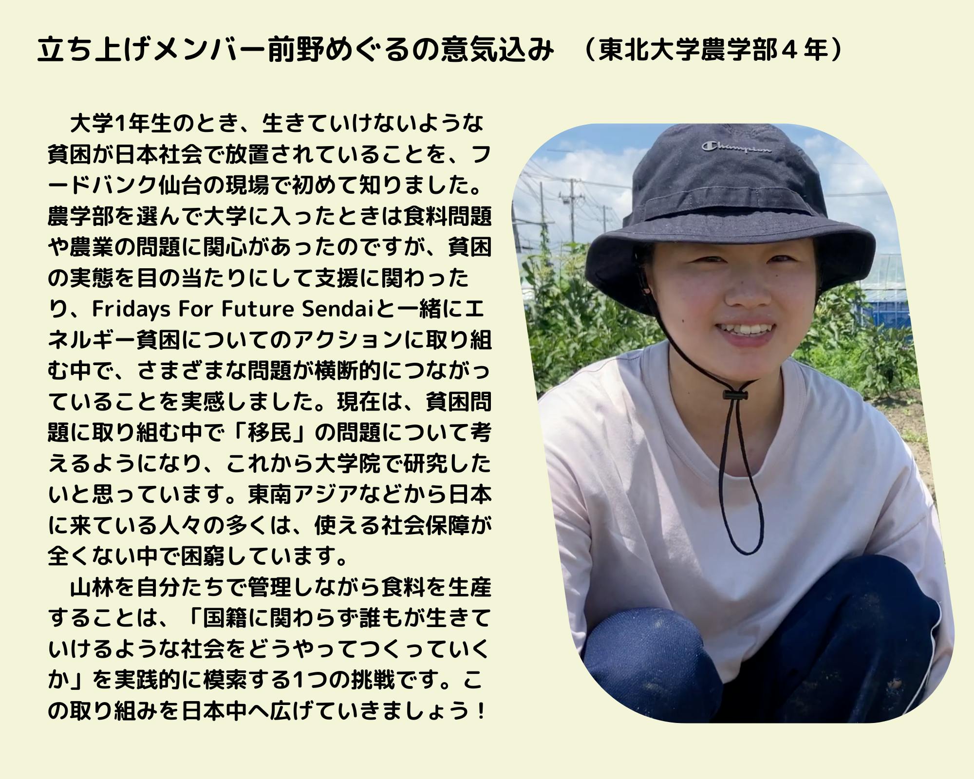 東北大学の学生たちのチャレンジを応援します。これまでは彼らは、温暖化問題に関わるFridays for Future仙台や仙台のフードバンクの活動に関わってきました。しかし、仙台の山を削るような自然破壊型のメガソーラーが建設されるのを黙って見ることができずに、このような新たな活動を始めます。彼らの根底にあるのは、「不正義をなんとかしたい」という熱い気持ちであり、それは環境問題だけでなく、貧困や差別の問題にも関わります。それらを同時に解決するために、そして農学を学んでいるという特性を活かすために彼らが考え抜いて出した結論が、今回のフードフォレストを広めるという活動です。アグロフォレストリー自体は世界中で実践されており、その効果は明らかになっています。彼らは覚悟をもって取り組んでいて、計画も非常に具体的です。ぜひともあたたかいご支援をよろしくお願いします。