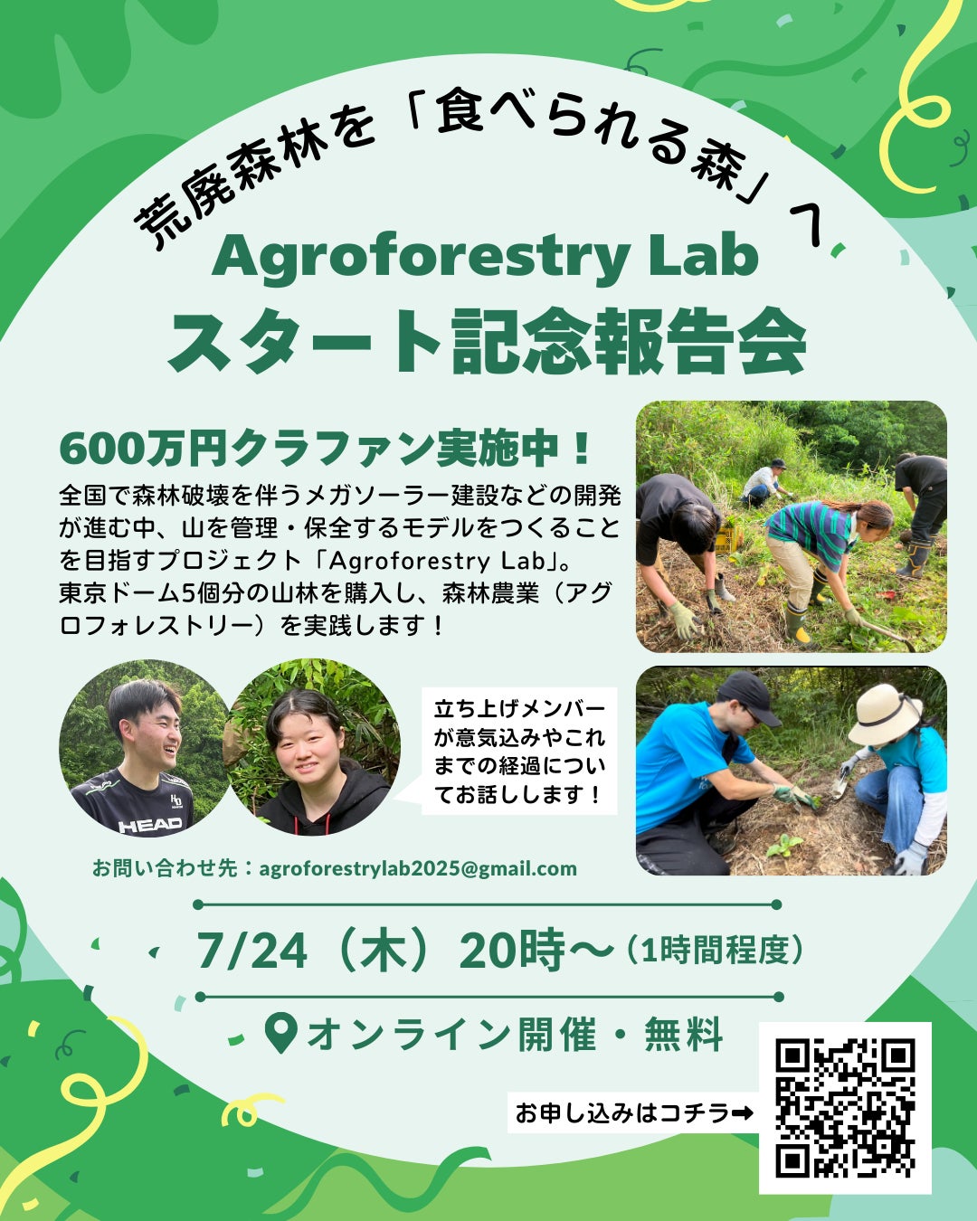 ご支援いただいた皆様や、私たちのプロジェクトに関心を寄せていただいた方々に「Agroforestry Lab」プロジェクトについてさらに知っていただくための報告会を開催いたします。報告会では、立ち上げメンバーの意気込みやこれまでの経過をお話する予定です。クラウドファンディングのページでは紹介しきれない、私たちのこのプロジェクトへの思いや活動内容について皆様にお伝えできる場にしたいと考えております。