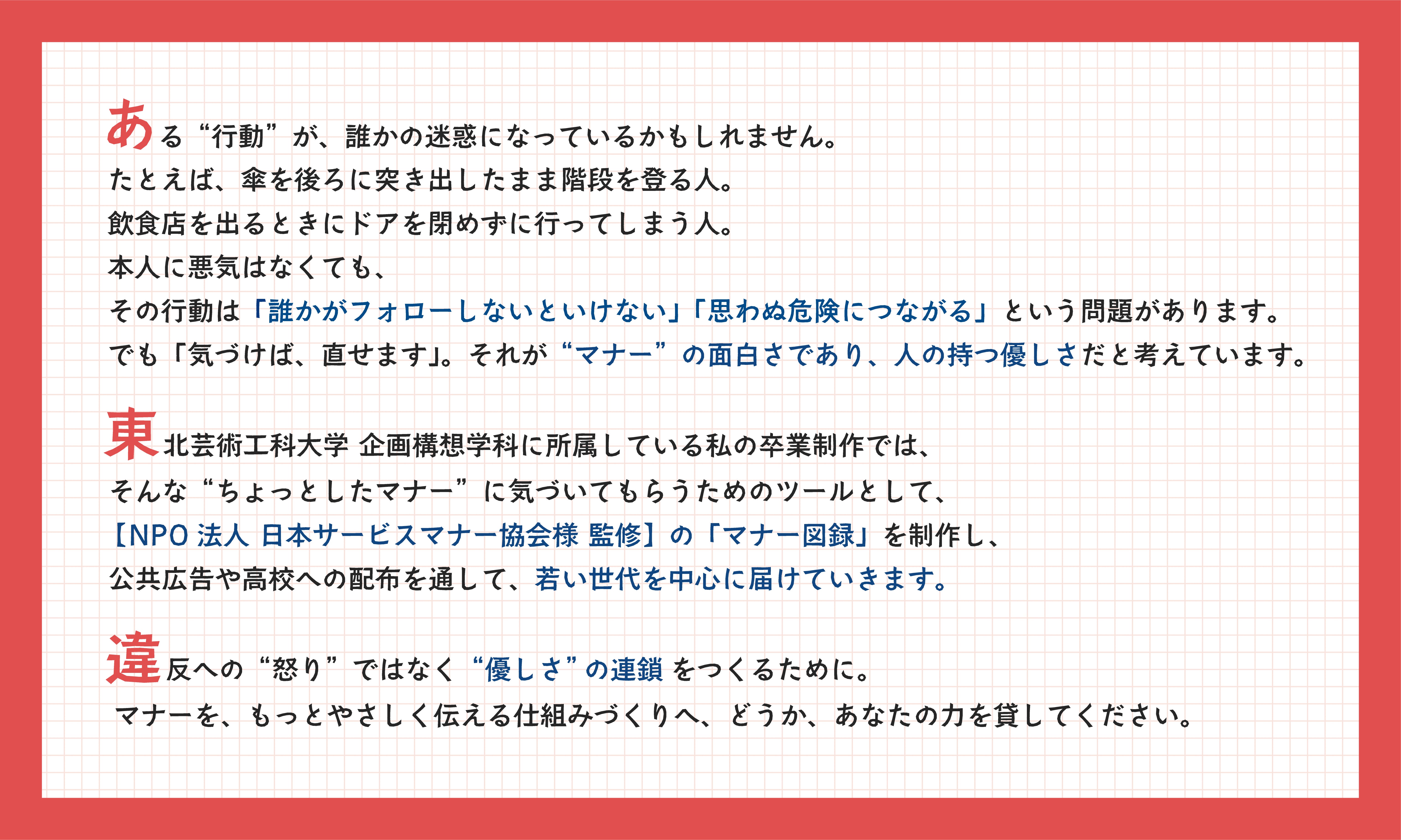 マナー図録を通じて若者に届けたいと思い、プロジェクトを始動しました。