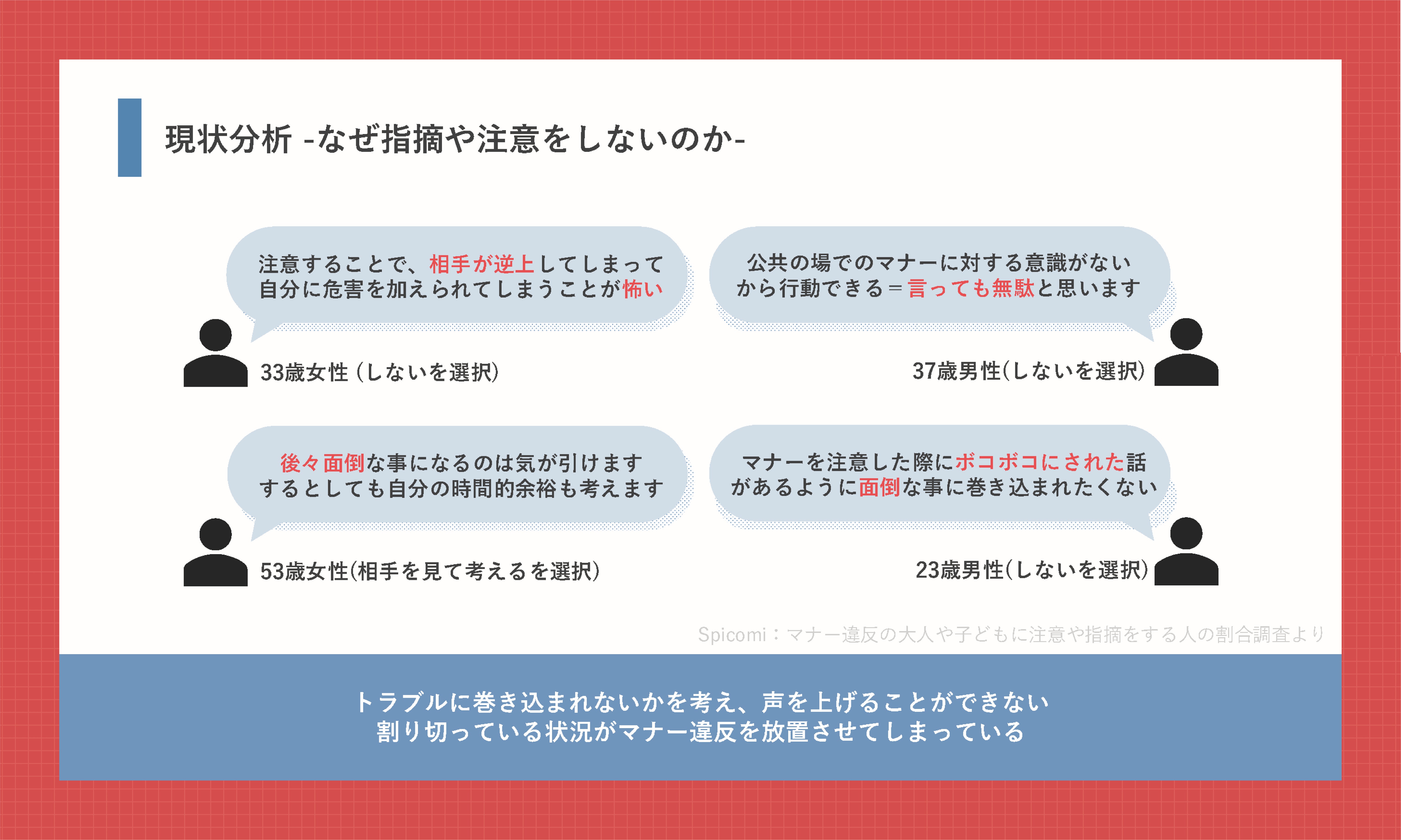 「公共空間における無意識のマナー違反」をテーマとしてあげ、
